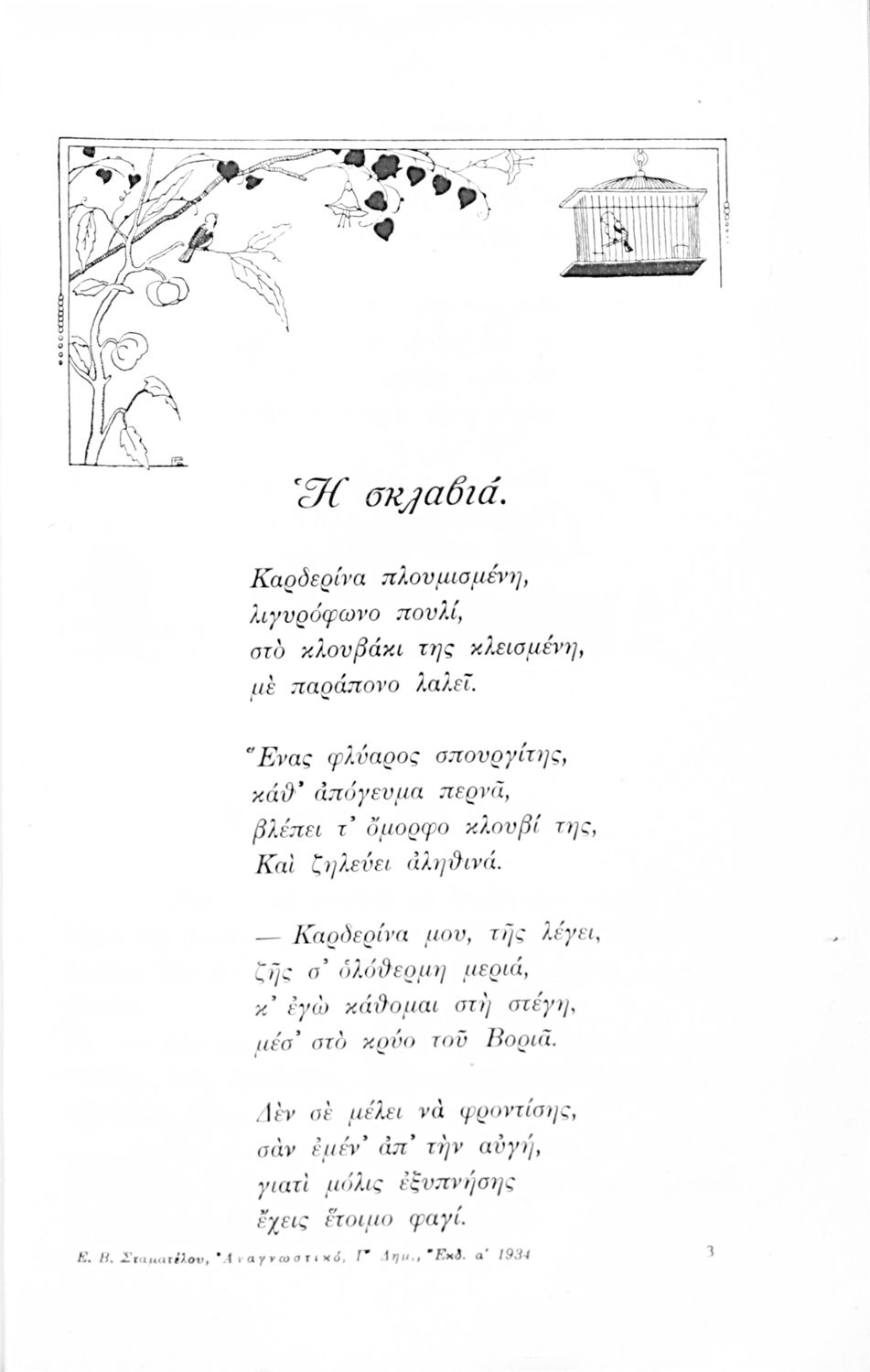 Αναγνωστικό Γ΄ Δημοτικού που περιλαμβάνει ποιήματα και πεζά με θέματα όπως η καλή και κακή συναναστροφή, η φρόνηση, η οκνηρία, η φιλανθρωπία και η πίστη στο Θεό