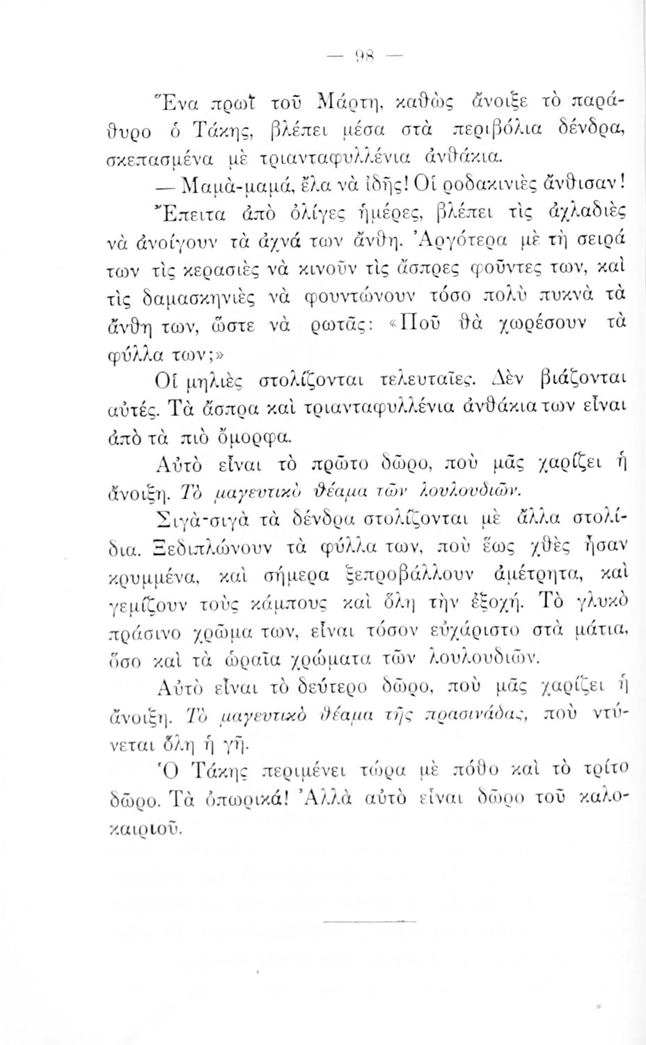 Αναγνωστικό Γ' Δημοτικού που είναι χωρισμένο σύμφωνα με τις εποχές του χρόνου και περιλαμβάνει ποιήματα και πεζά εμπνευσμένα από τη ζωή στην ύπαιθρο, την εθνική, οικογενειακή και κοινωνική ζωή, τη θρησκευτική ...