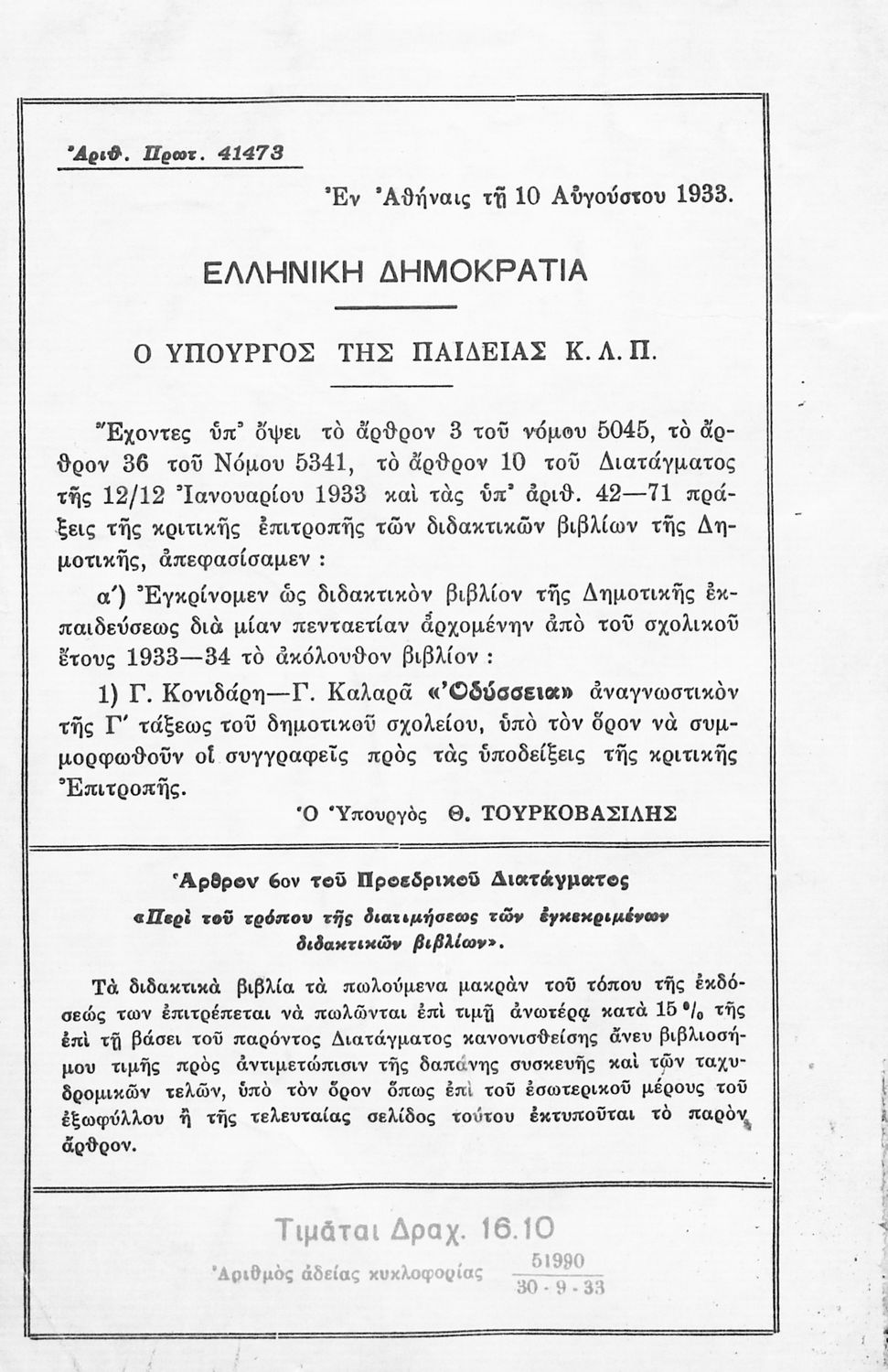 Υπουργική απόφαση / Σύμβαση: 41473/10-8-1933