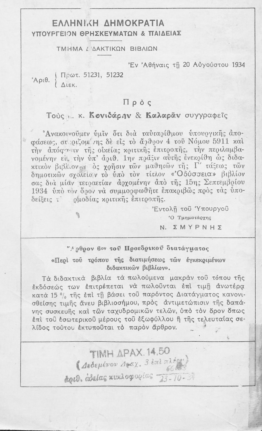 Υπουργική απόφαση / Σύμβαση: 51231, 51232/20-8-1934
