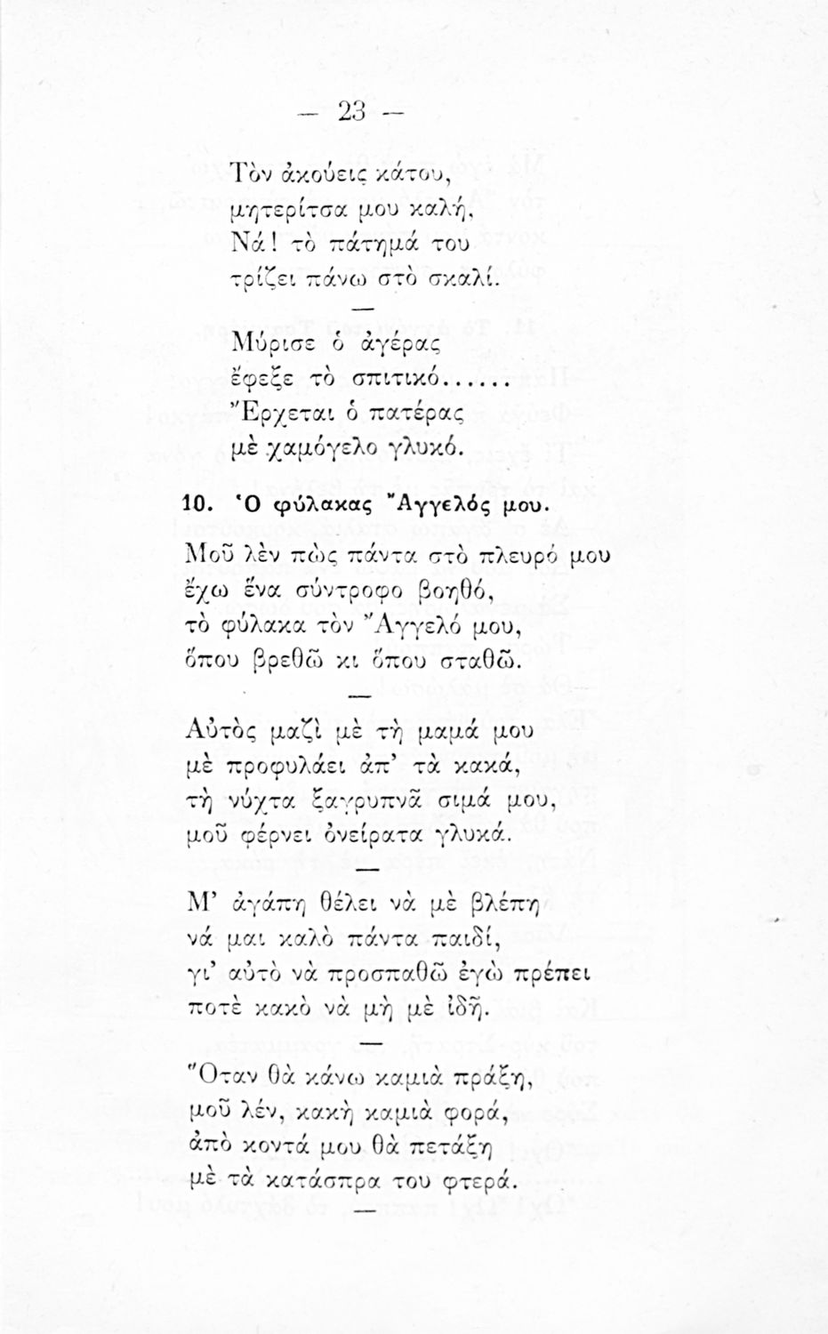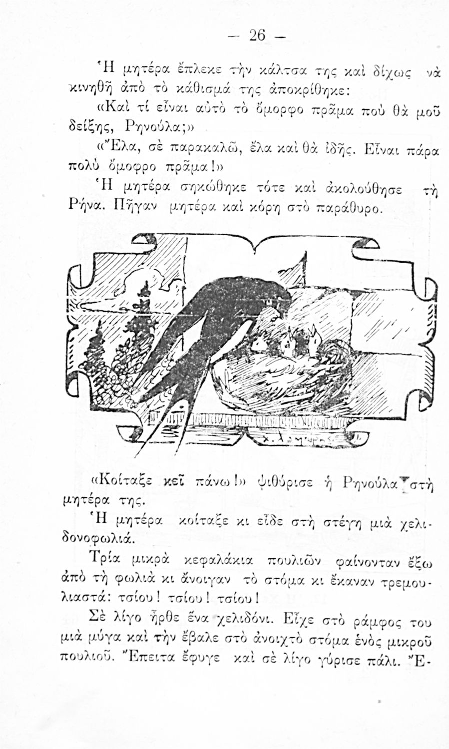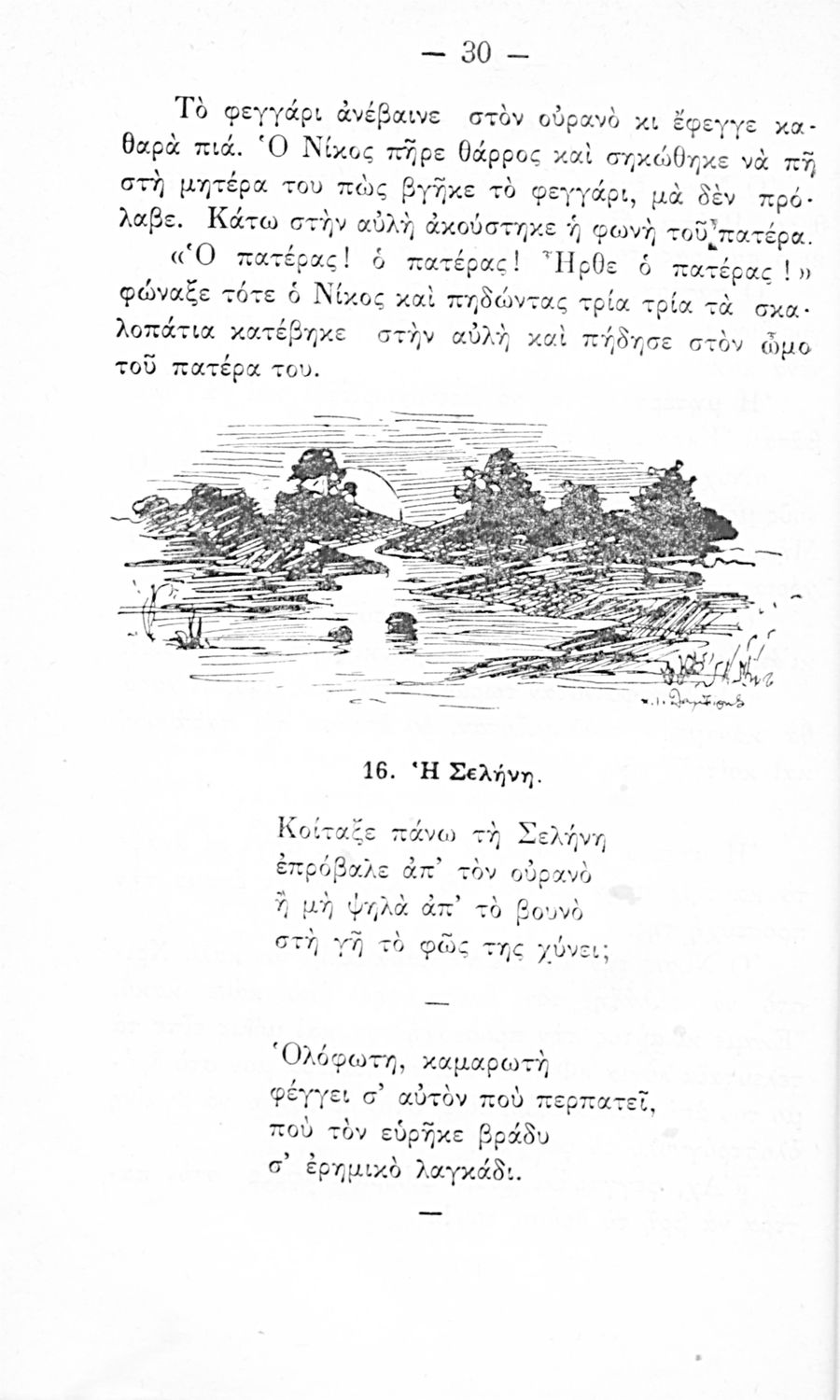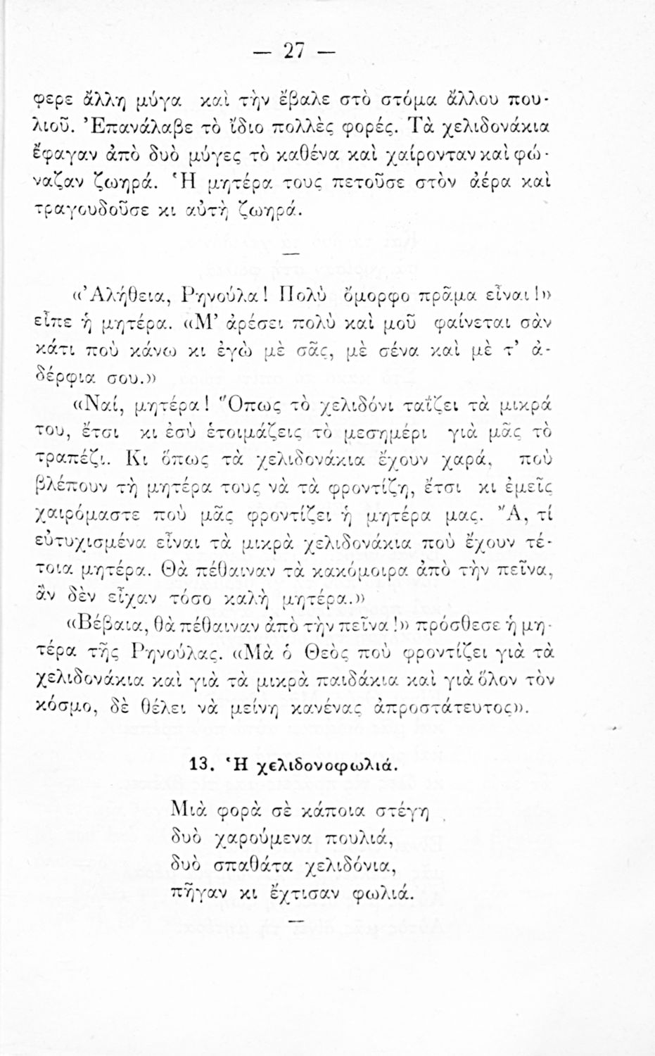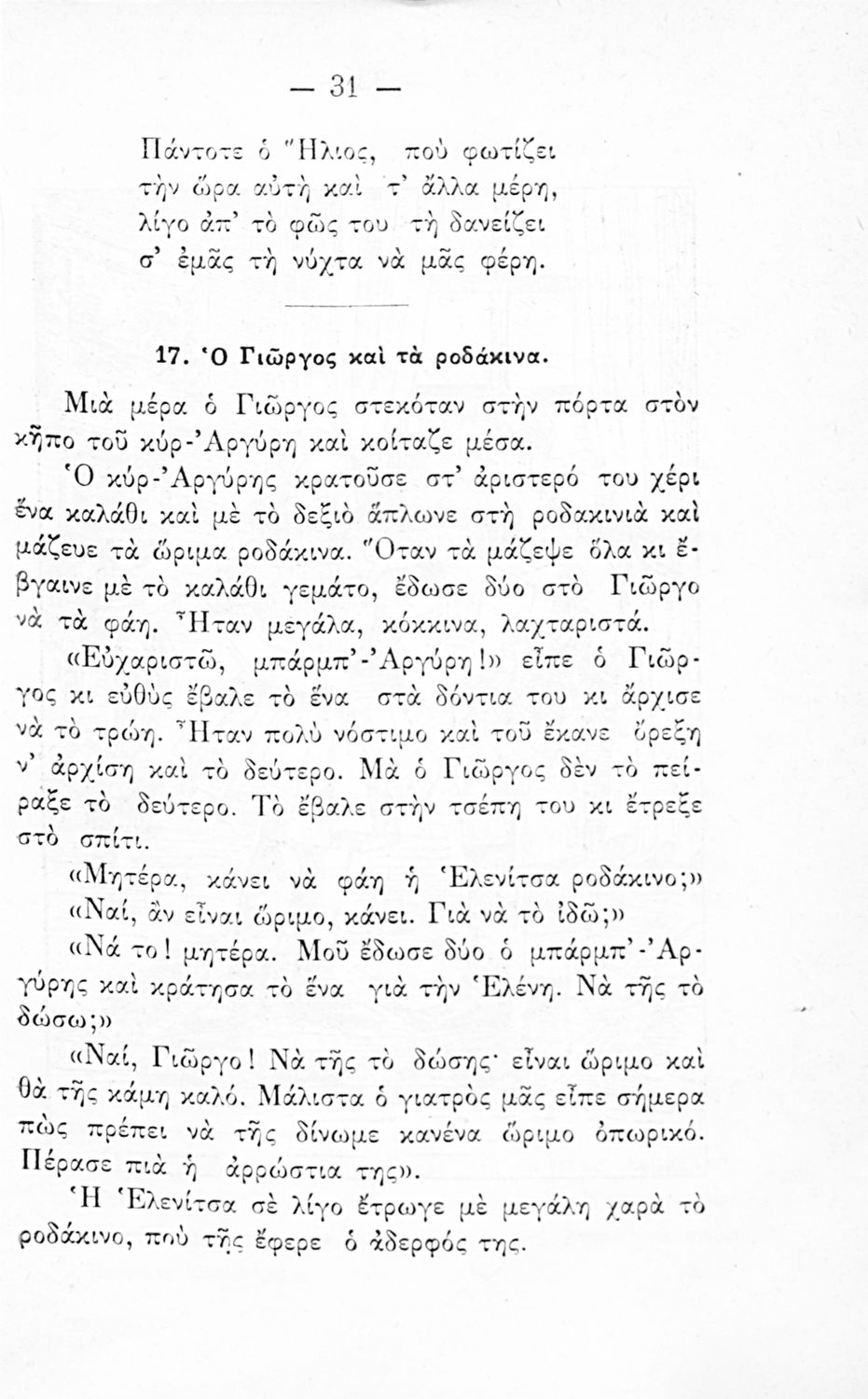 Αναγνωστικό για τους μαθητές της Γ΄ Δημοτικού που περιλαμβάνει ποιήματα και πεζά με θέματα από την καθημερινή ζωή των Ελλήνων και την μυθολογία τους. Περιέχει και "μεθοδικές οδηγίες για το δάσκαλο".