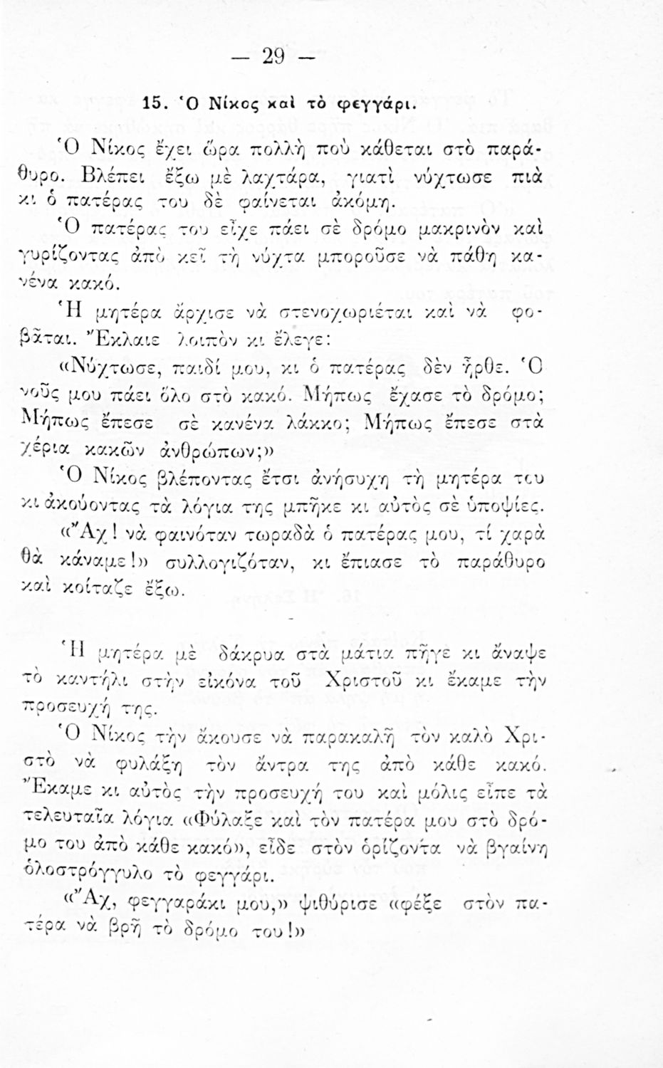 Αναγνωστικό Γ΄ Δημοτικού που περιλαμβάνει ποιήματα και πεζά με θέματα όπως η καλή και κακή συναναστροφή, η φρόνηση, η οκνηρία, η φιλανθρωπία και η πίστη στο Θεό
