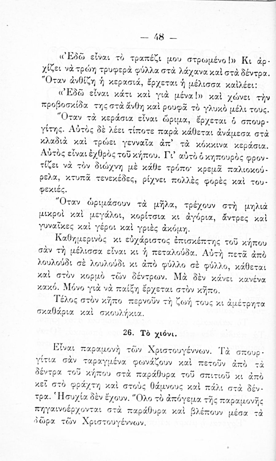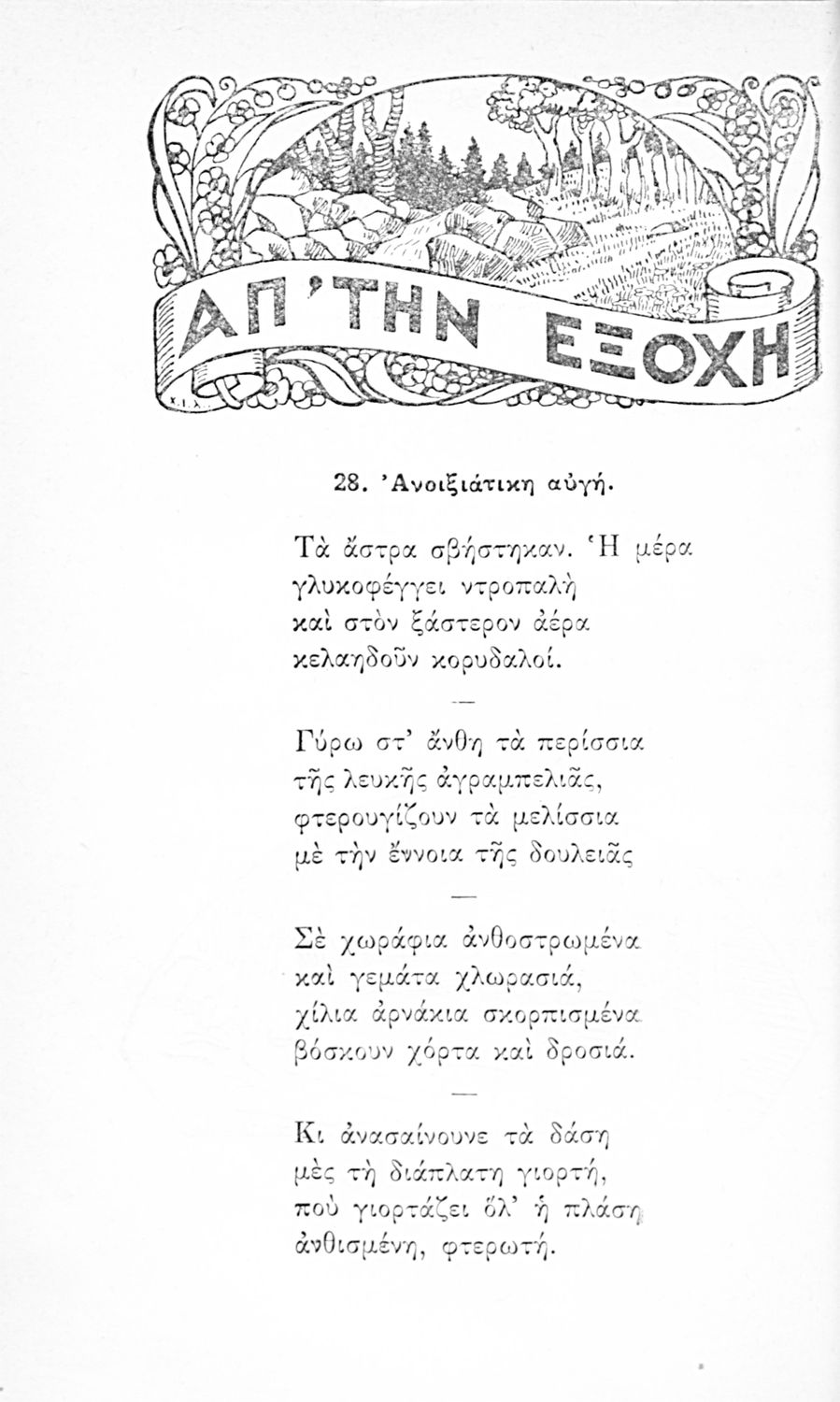 Αναγνωστικό για τους μαθητές της Γ΄ Δημοτικού που περιλαμβάνει ποιήματα και πεζά με θέματα από την καθημερινή ζωή των Ελλήνων και την μυθολογία τους. Περιέχει και "μεθοδικές οδηγίες για το δάσκαλο".