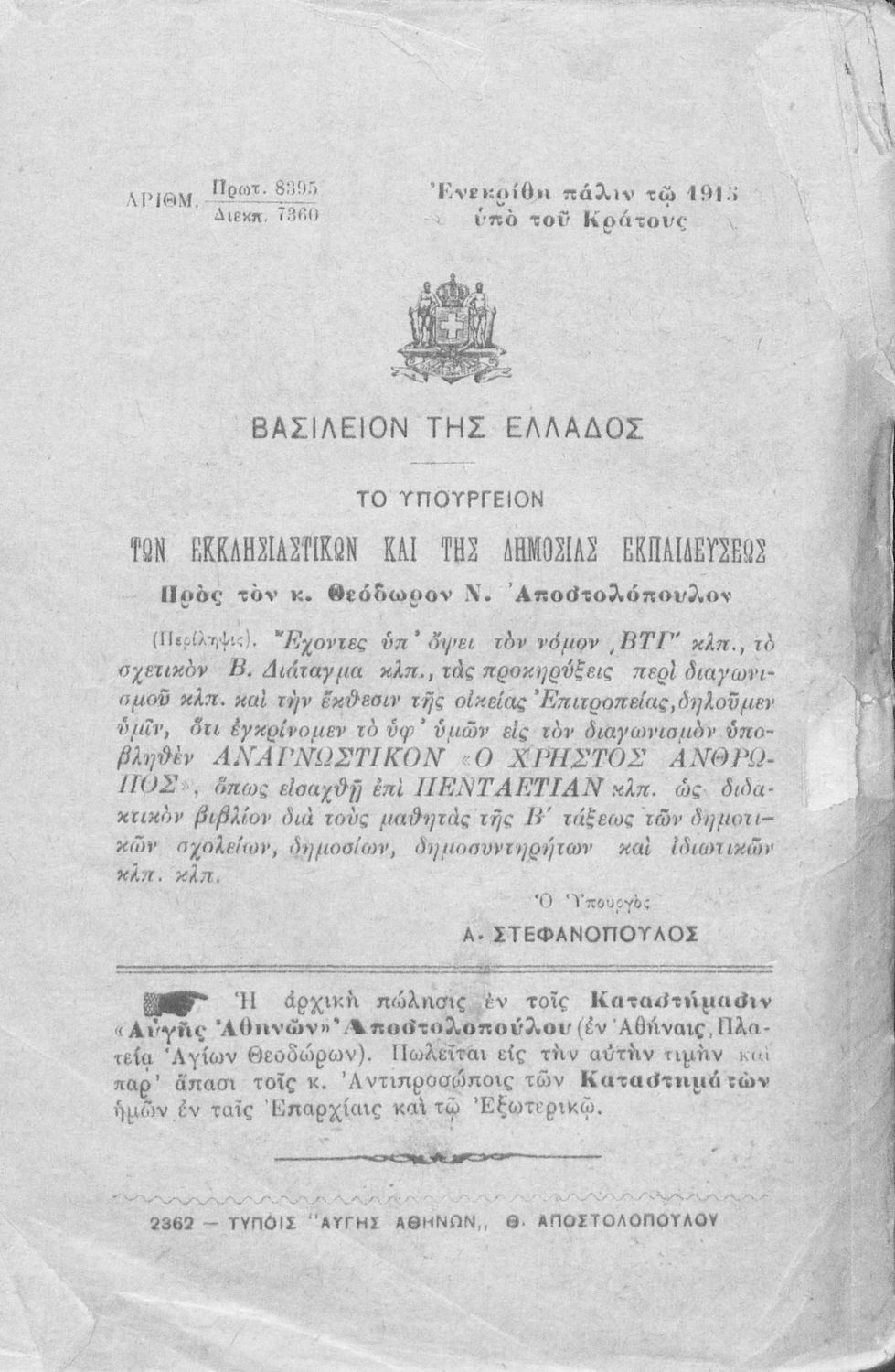 Ο Χρηστός Άνθρωπος Αναγνωστικό της Τρίτης Τάξεως των Δημοτικών Σχολείων Αρρένων και Θηλέων