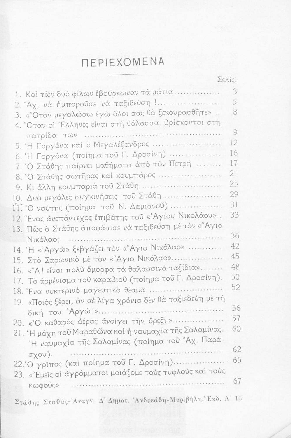 Αναγνωστικό για την Δ΄ τάξη του Δημοτικού. Περιλαμβάνει ένα κείμενο στο οποίο παρεμβάλλονται ποιήματα δημοτικά και Ελλήνων ποιητών.