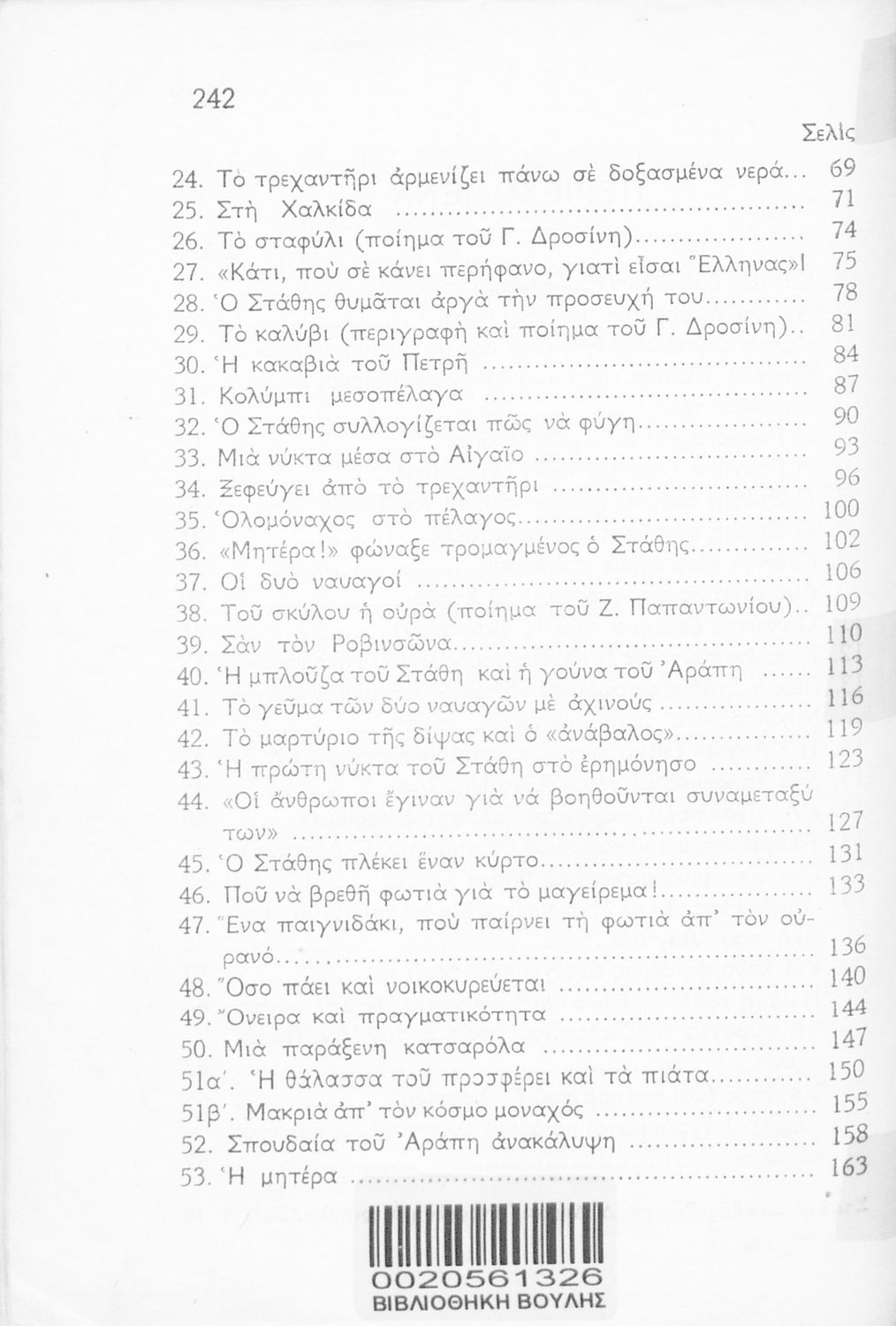 Αναγνωστικό της Δ΄ Τάξης Δημοτικού για το μάθημα της Γλώσσας. Περιλαμβάνει αφηγηματικές ιστορίες από τη ζωή του βασικού ήρωα Στάθη Σταθά. Οι εμπειρίες του ήρωα είναι κυρίως από τη θάλασσα. Περιέχει εικόνες, οι οποίες οπτικοποιούν τα κείμενα και βοηθούν στην διδασκαλία.