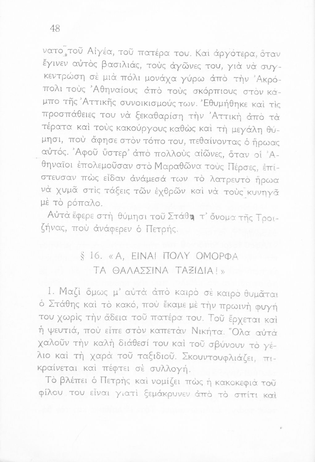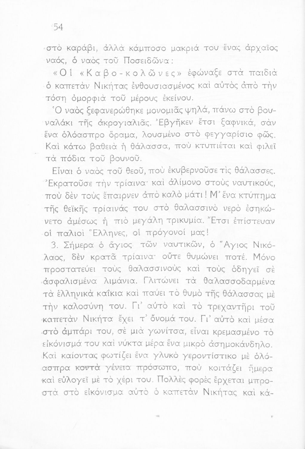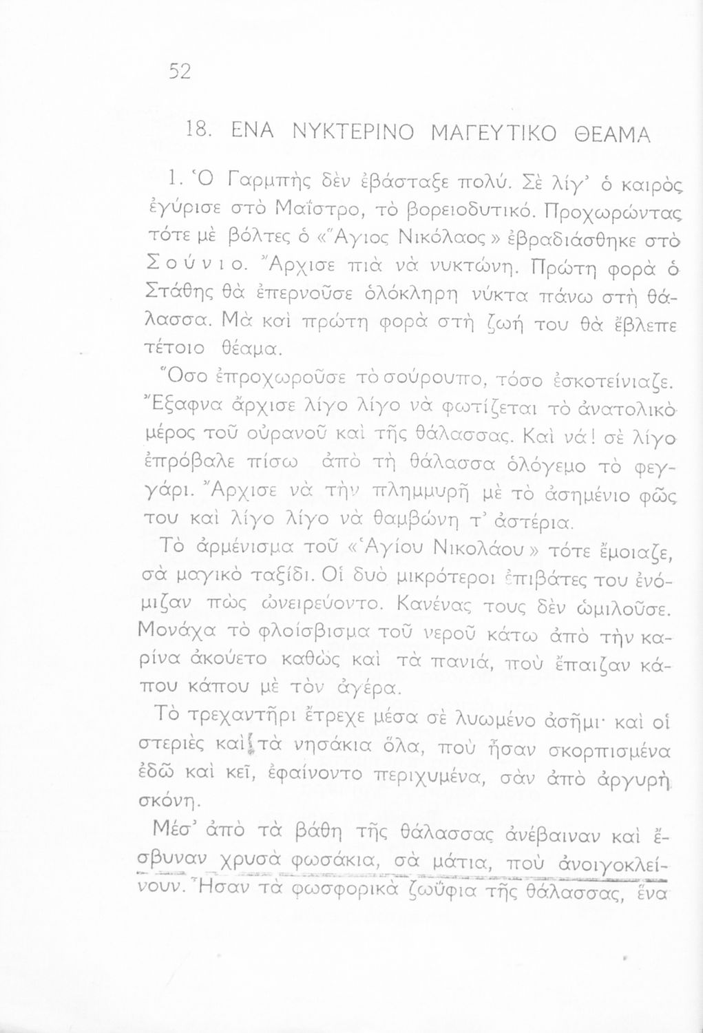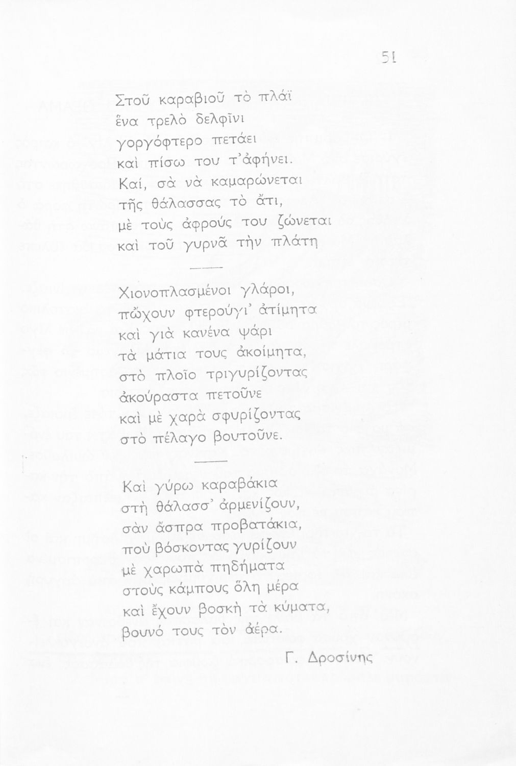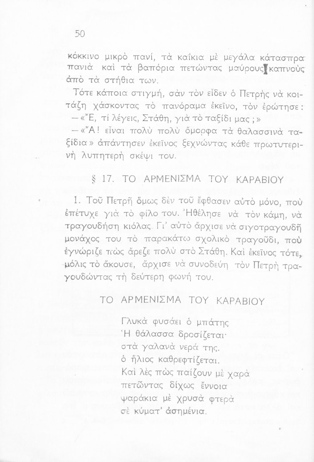 Αναγνωστικό για την Δ΄ τάξη του Δημοτικού. Περιλαμβάνει ένα κείμενο στο οποίο παρεμβάλλονται ποιήματα δημοτικά και Ελλήνων ποιητών.