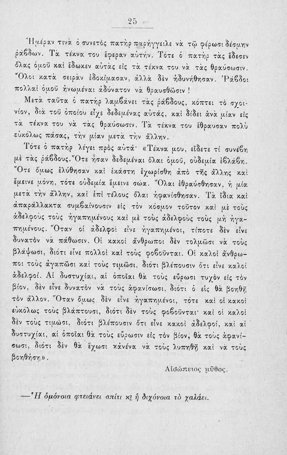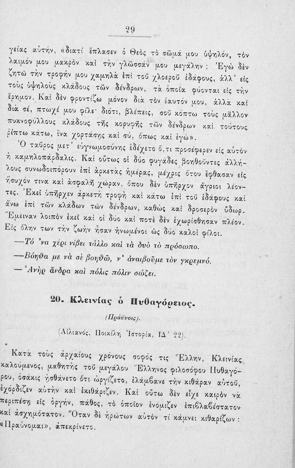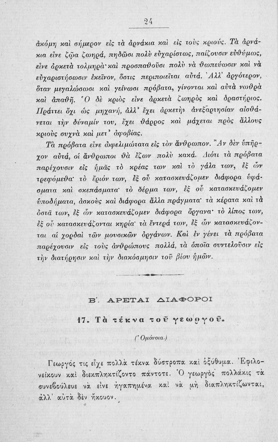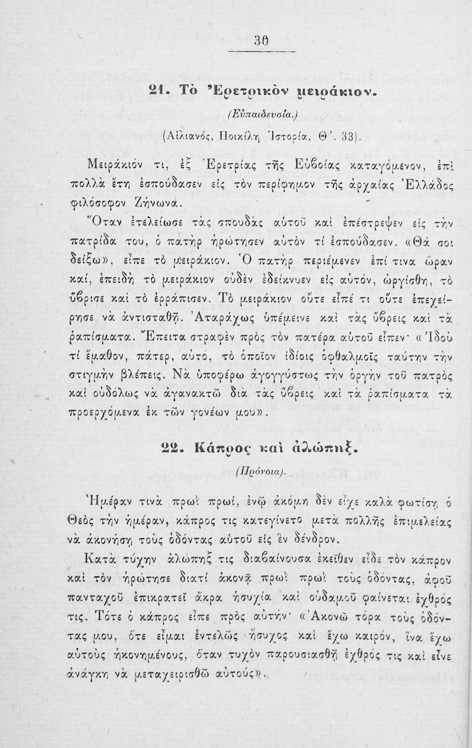 Βαθμίδα εκπαίδευσης: Πρωτοβάθμια Τάξη: Δ' Δημοτικού Μάθημα: Νέα Ελληνικά Γλώσσα: Απλή καθαρεύουσα Παρουσίαση περιεχομένου: Αναγνωστικό Δ' Δημοτικού που περιλαμβάνει πεζά και ποιήματα, ηθικοπλαστικού περιεχομένου, εμπνευσμένα από την ελληνική μυθολογία και το φυσικό περιβάλλον, με σκοπό να προβάλει αξίες και αρετές όπως η τιμιότητα, η ευσπλαχνία, η γενναιότητα, η αγάπη, η φιλοπατρία, κι η ευγνωμοσύνη. |