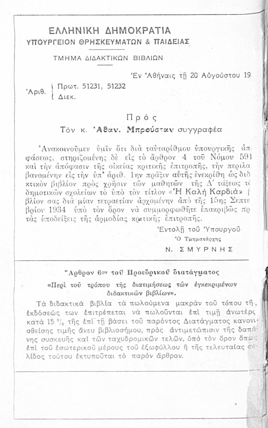 Εκδότης: Ιωάννης Δ. Κολλάρος Έτος έκδοσης: 1934 Τόπος έκδοσης: Αθήνα Έκδοση: 1η Υπουργική απόφαση / Σύμβαση: 51231/51232/20-8-1934 Έτος έγκρισης: 1934 |