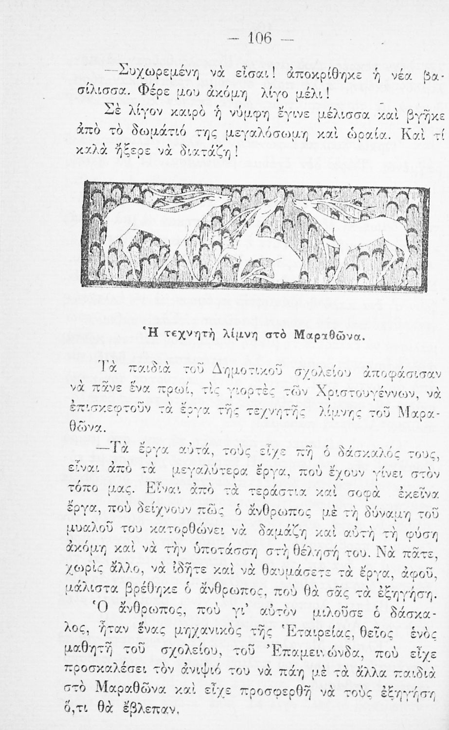 Αναγνωστικό Δ΄ Δημοτικού που περιέχει πεζά και ποιήματα με περιεχόμενο διδακτικό και ηθικοπλαστικό εμπνευσμένα από την ελληνική ιστορία και μυθολογία, και την αγροτική και κοινωνική ζωή.