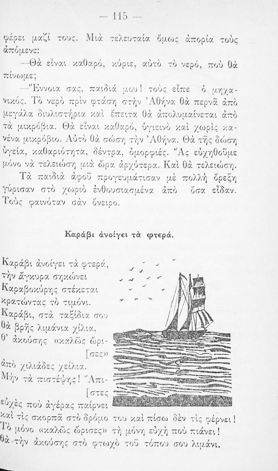 Αναγνωστικό για την Δ΄ τάξη του Δημοτικού. Περιλαμβάνει ένα κείμενο στο οποίο παρεμβάλλονται ποιήματα δημοτικά και Ελλήνων ποιητών.