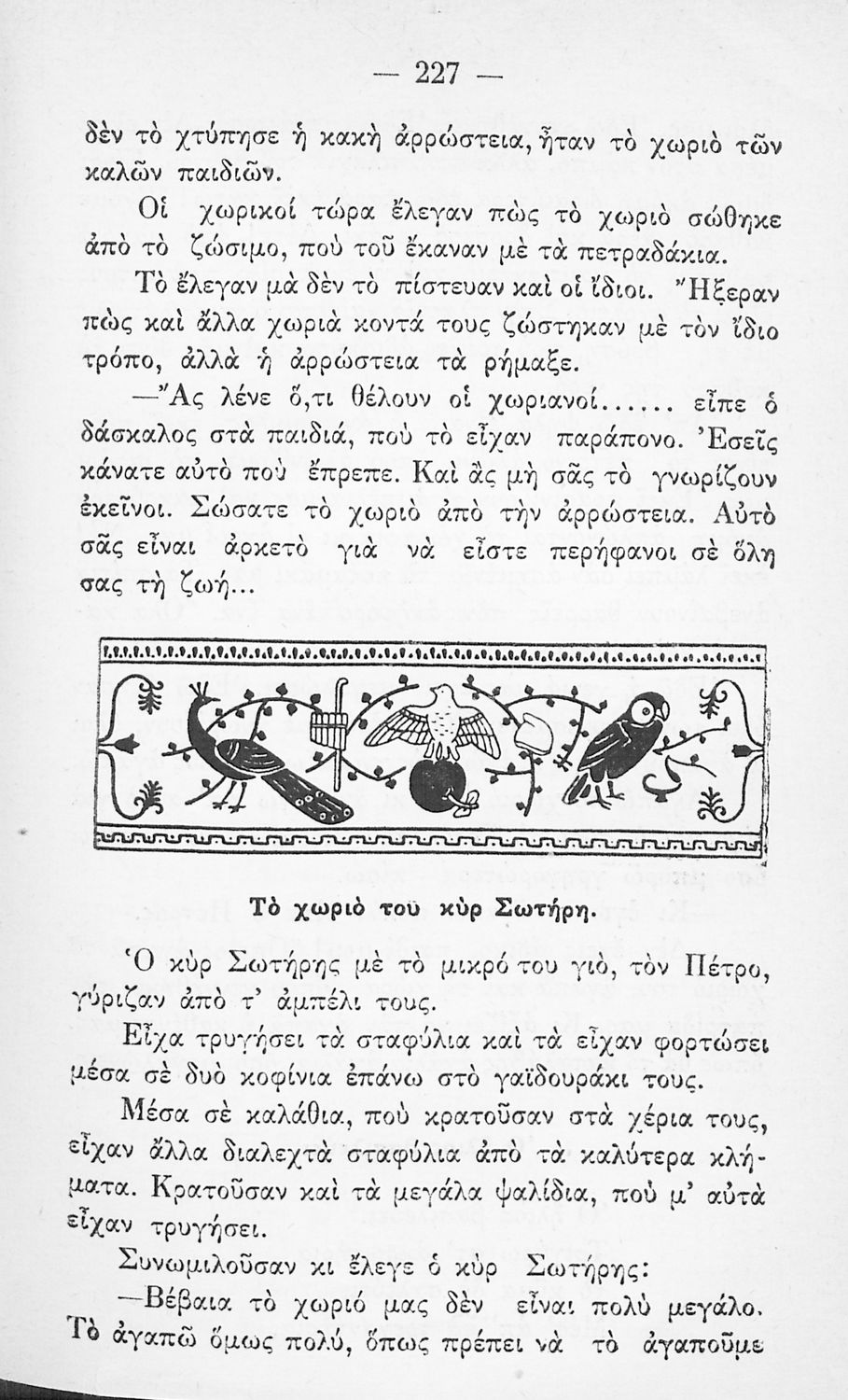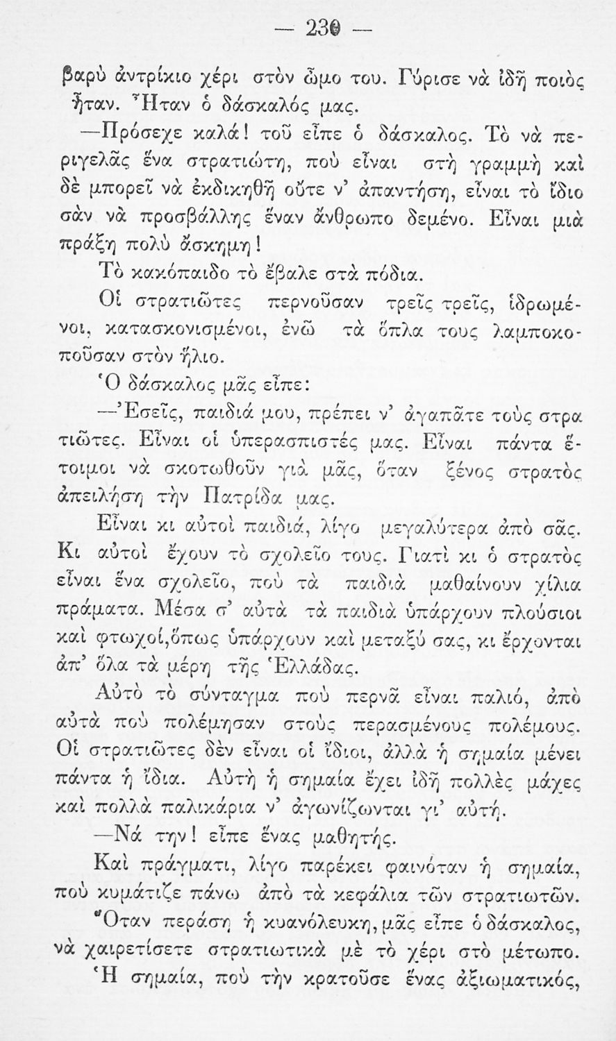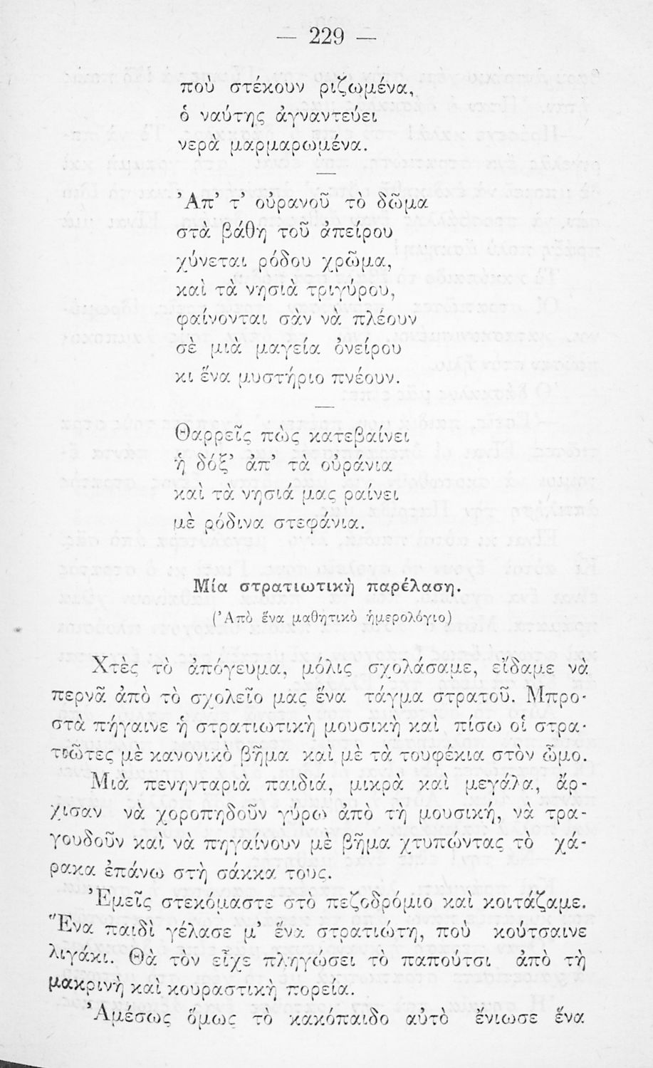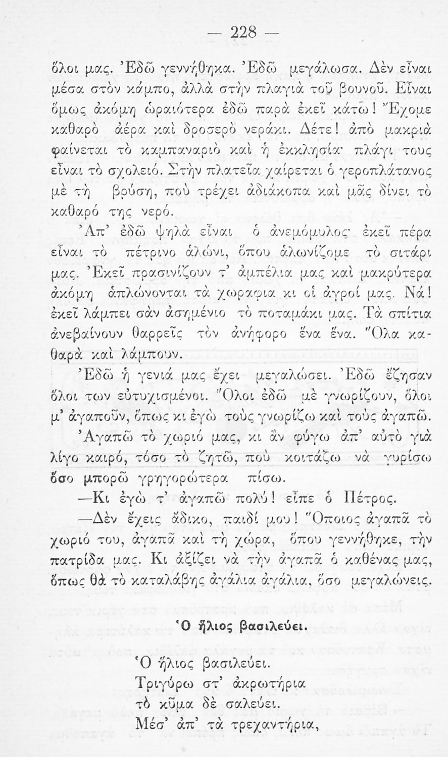Αναγνωστικό Δ΄ Δημοτικού που περιέχει πεζά και ποιήματα με περιεχόμενο διδακτικό και ηθικοπλαστικό εμπνευσμένα από την ελληνική ιστορία και μυθολογία, και την αγροτική και κοινωνική ζωή.