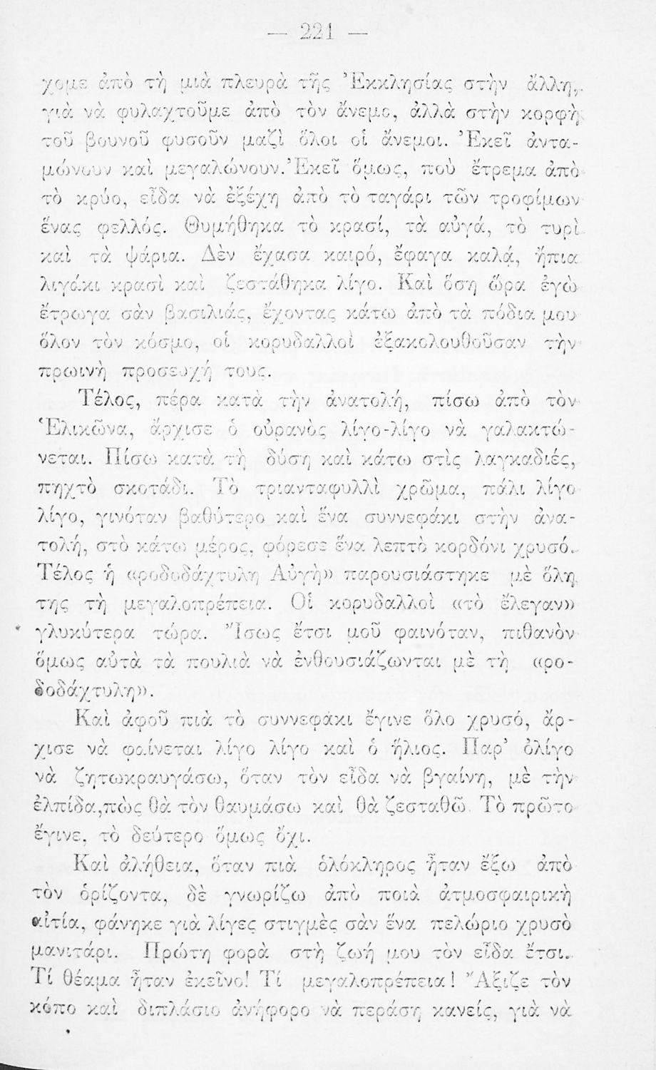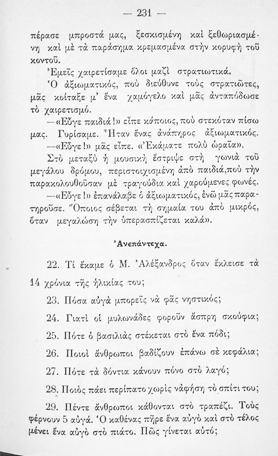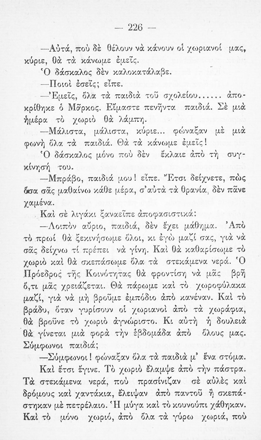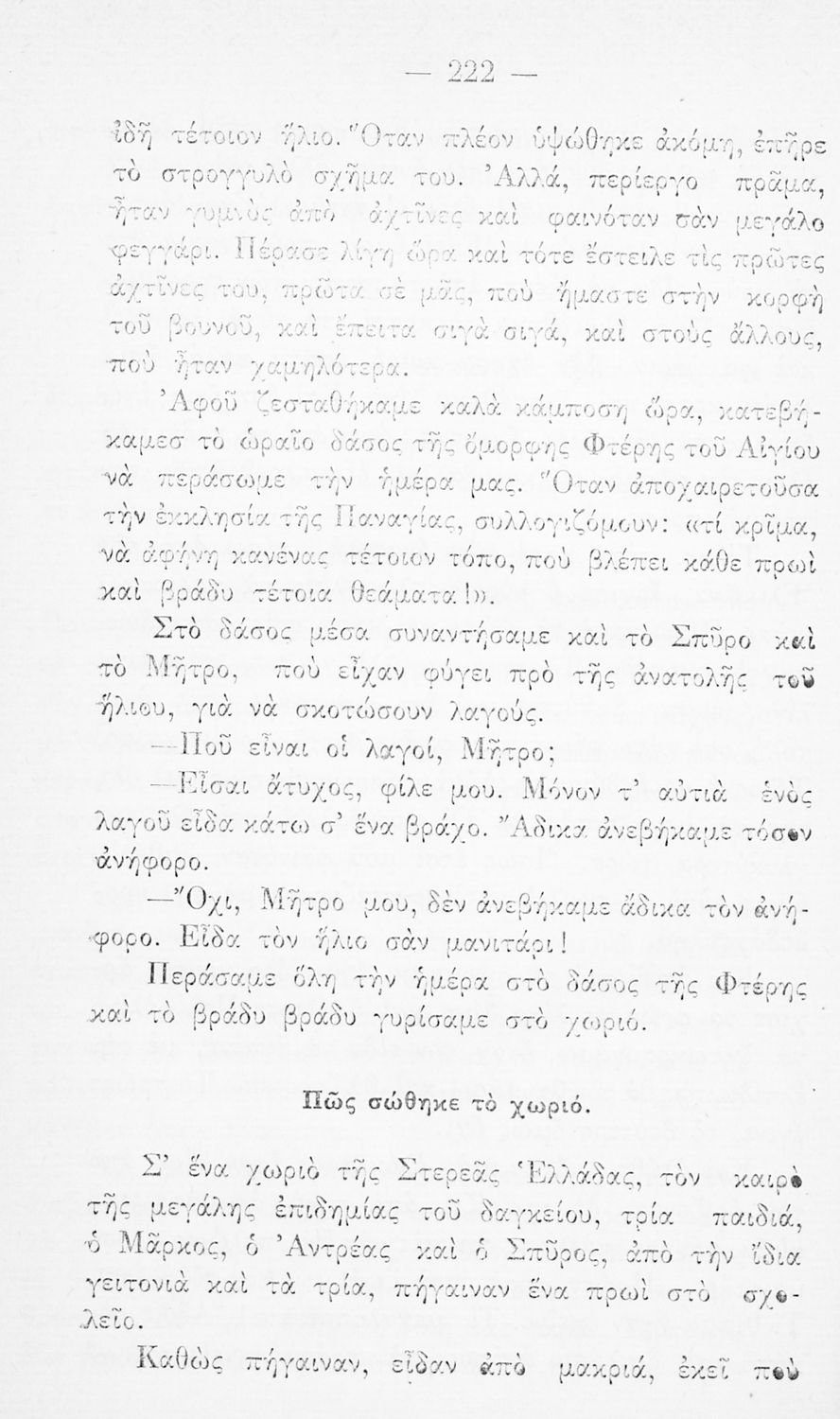 Αναγνωστικό Δ΄ Δημοτικού που περιέχει πεζά και ποιήματα με περιεχόμενο διδακτικό και ηθικοπλαστικό εμπνευσμένα από την ελληνική ιστορία και μυθολογία, και την αγροτική και κοινωνική ζωή.