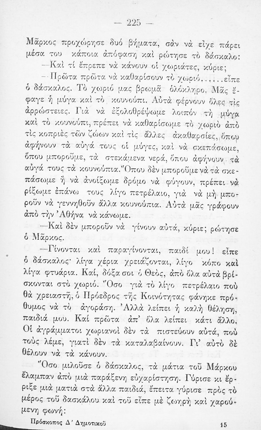 Αναγνωστικό Δ΄ Δημοτικού που περιέχει πεζά και ποιήματα με περιεχόμενο διδακτικό και ηθικοπλαστικό εμπνευσμένα από την αγροτική ζωή και κοινωνική ζωή, την ελληνική φύση και παράδοση, και τις ασχολίες των ...