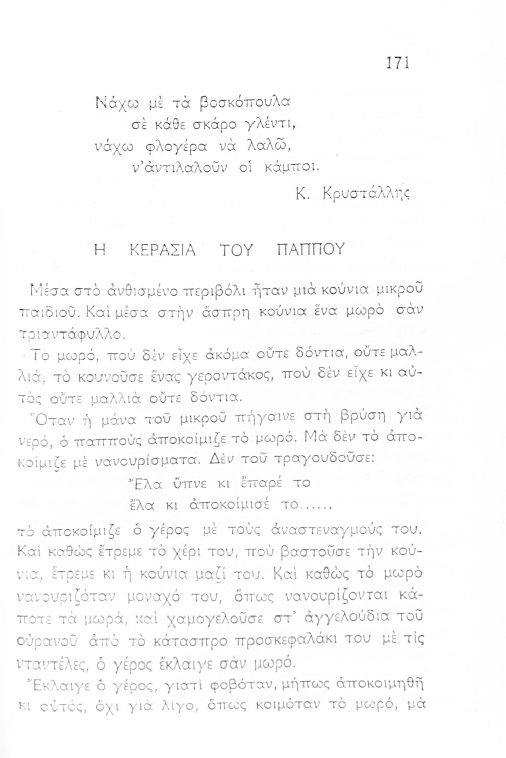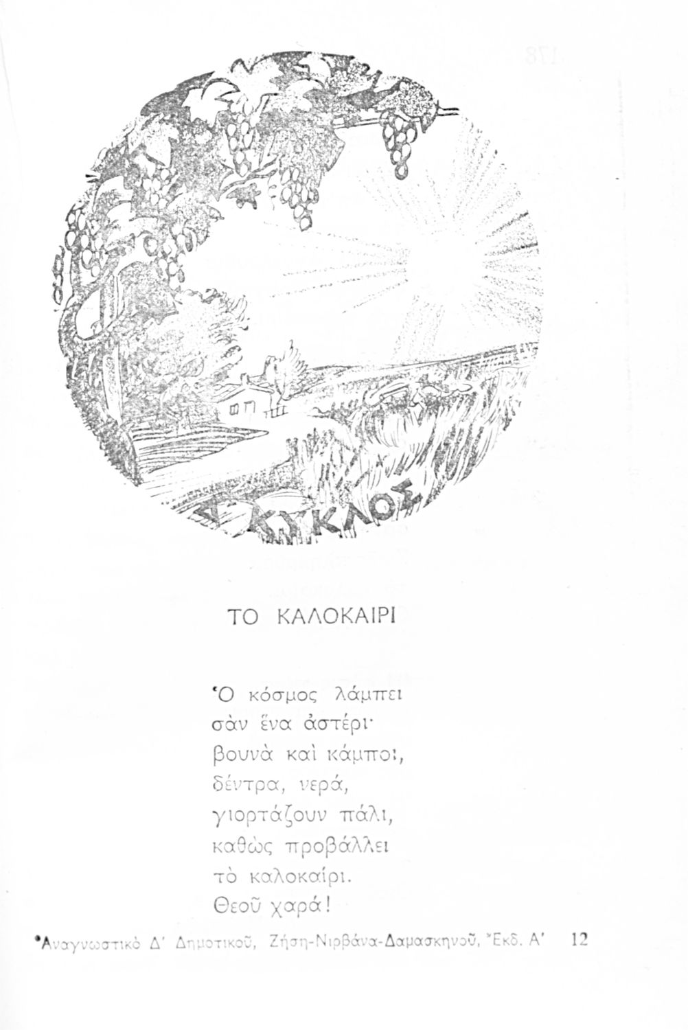 Αναγνωστικό Γ' Δημοτικού που περιέχει πεζά και ποιήματα εμπνευσμένα από τη θρησκευτική, εθνική, κοινωνική και ατομική ζωή, και την ελληνική φύση, ιστορία και μυθολογία.