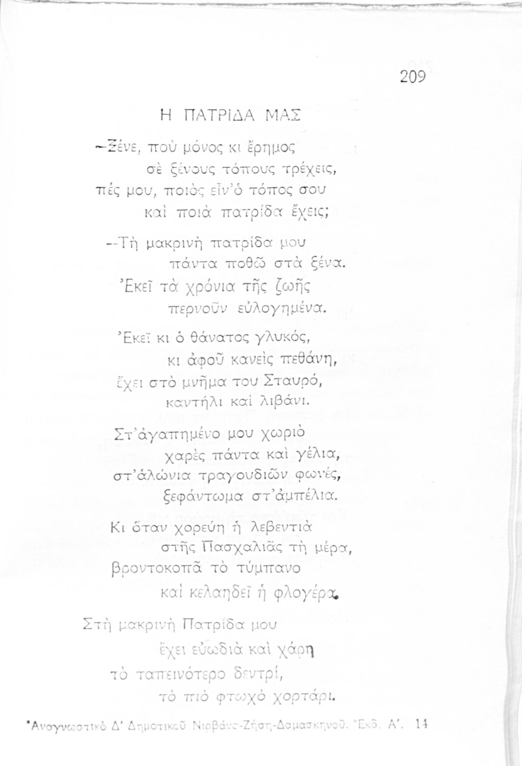 Αναγνωστικό για τους μαθητές της Δ΄ Δημοτικού που περιλαμβάνει ποιήματα και πεζά με θέματα από την καθημερινή ζωή των Ελλήνων, τη φύση, την ιστορία και την θρησκεία τους.