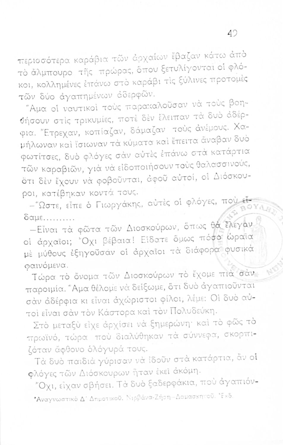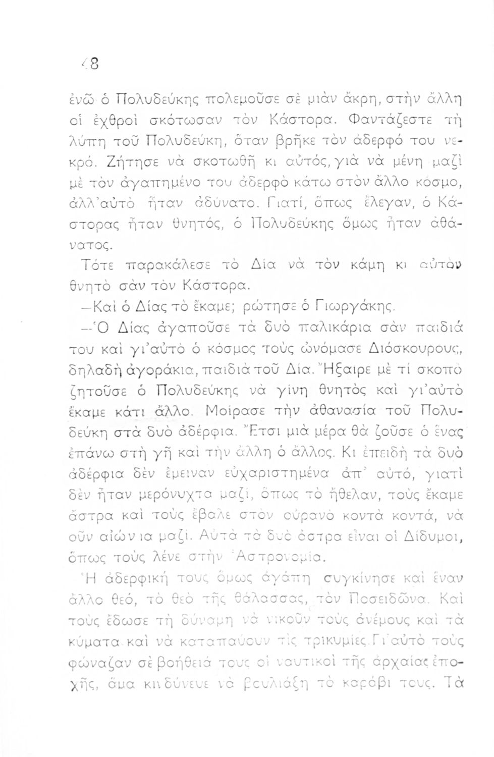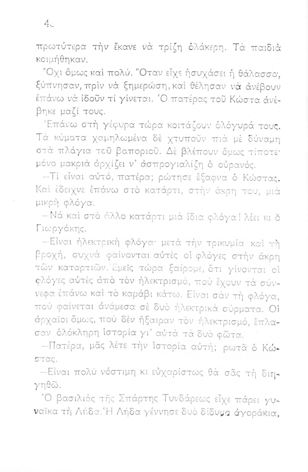Αναγνωστικό Δ΄ Δημοτικού που περιλαμβάνει θέματα από την θρησκευτική, οικογενειακή και σχολική ζωή του παιδιού, την ελληνική μυθολογία και ιστορία και τη ζωή των ζώων.