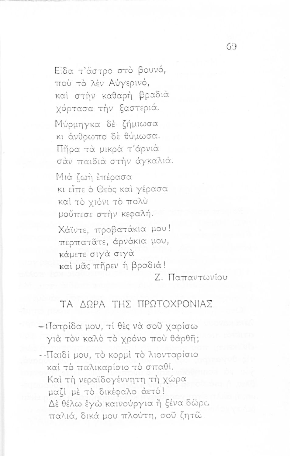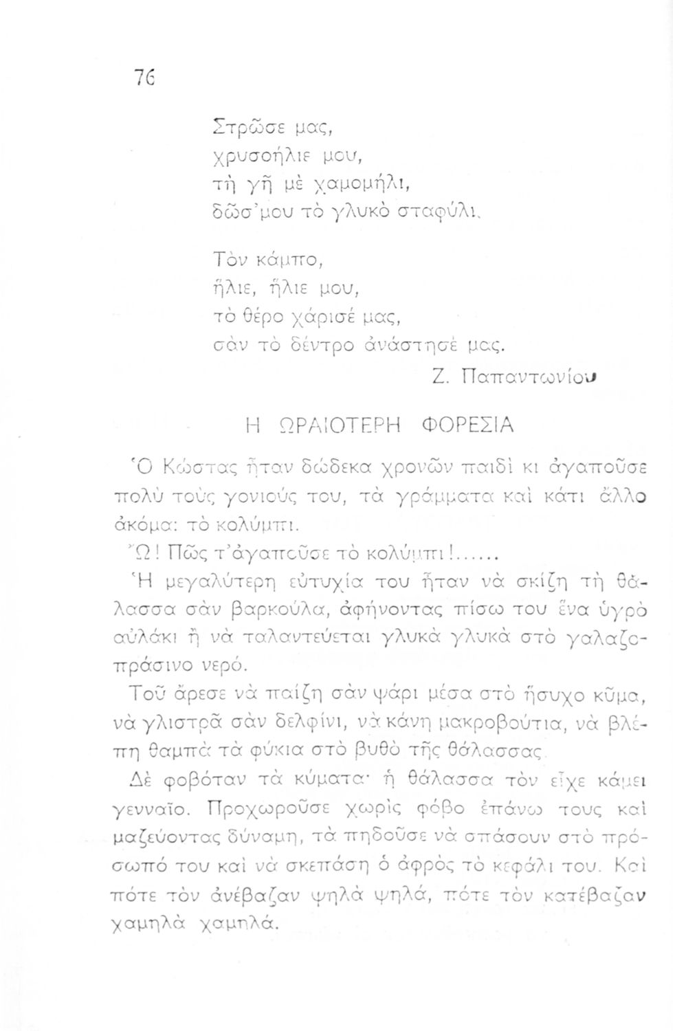 Αναγνωστικό Γ' Δημοτικού που περιέχει πεζά και ποιήματα εμπνευσμένα από τη θρησκευτική, εθνική, κοινωνική και ατομική ζωή, και την ελληνική φύση, ιστορία και μυθολογία.
