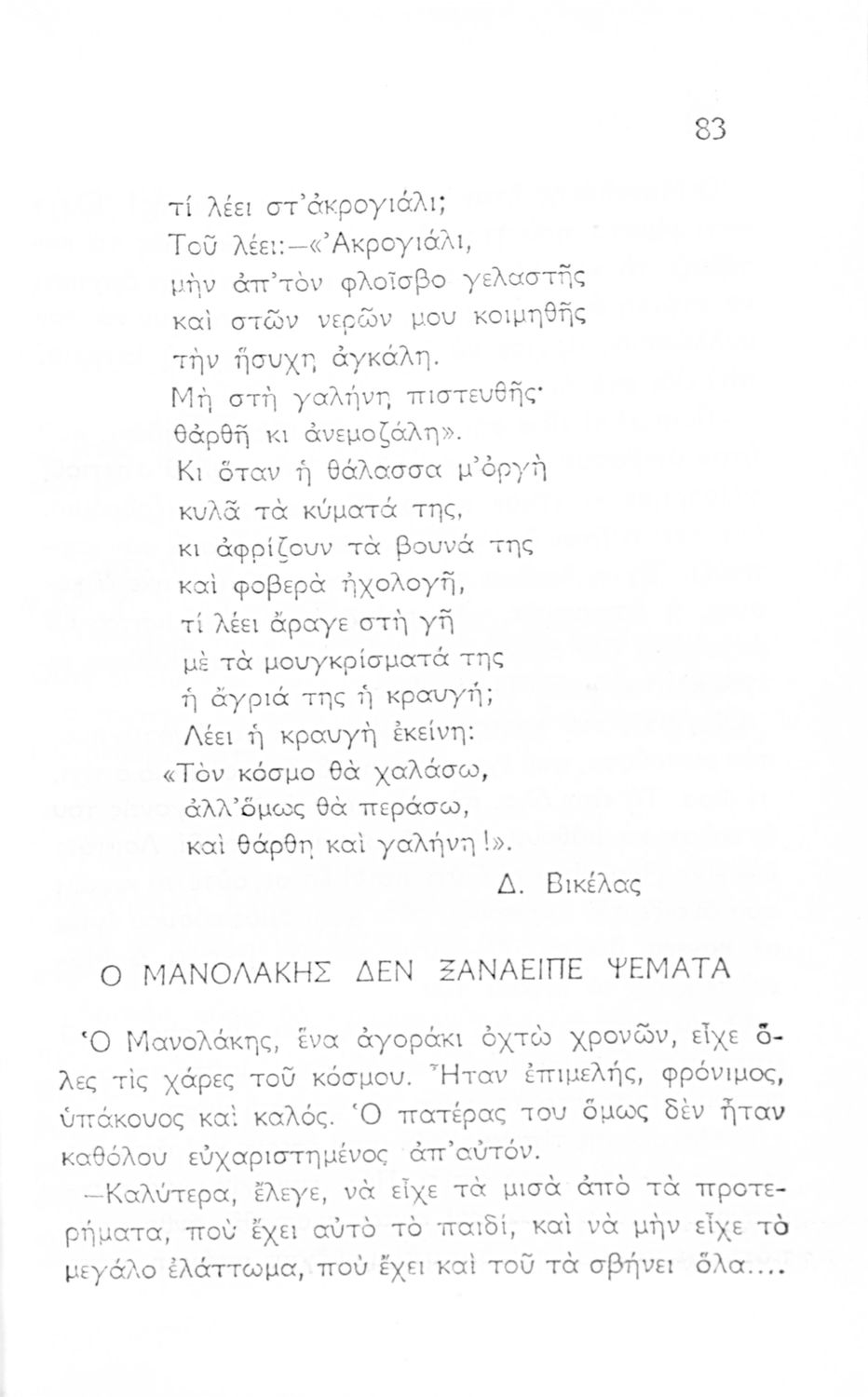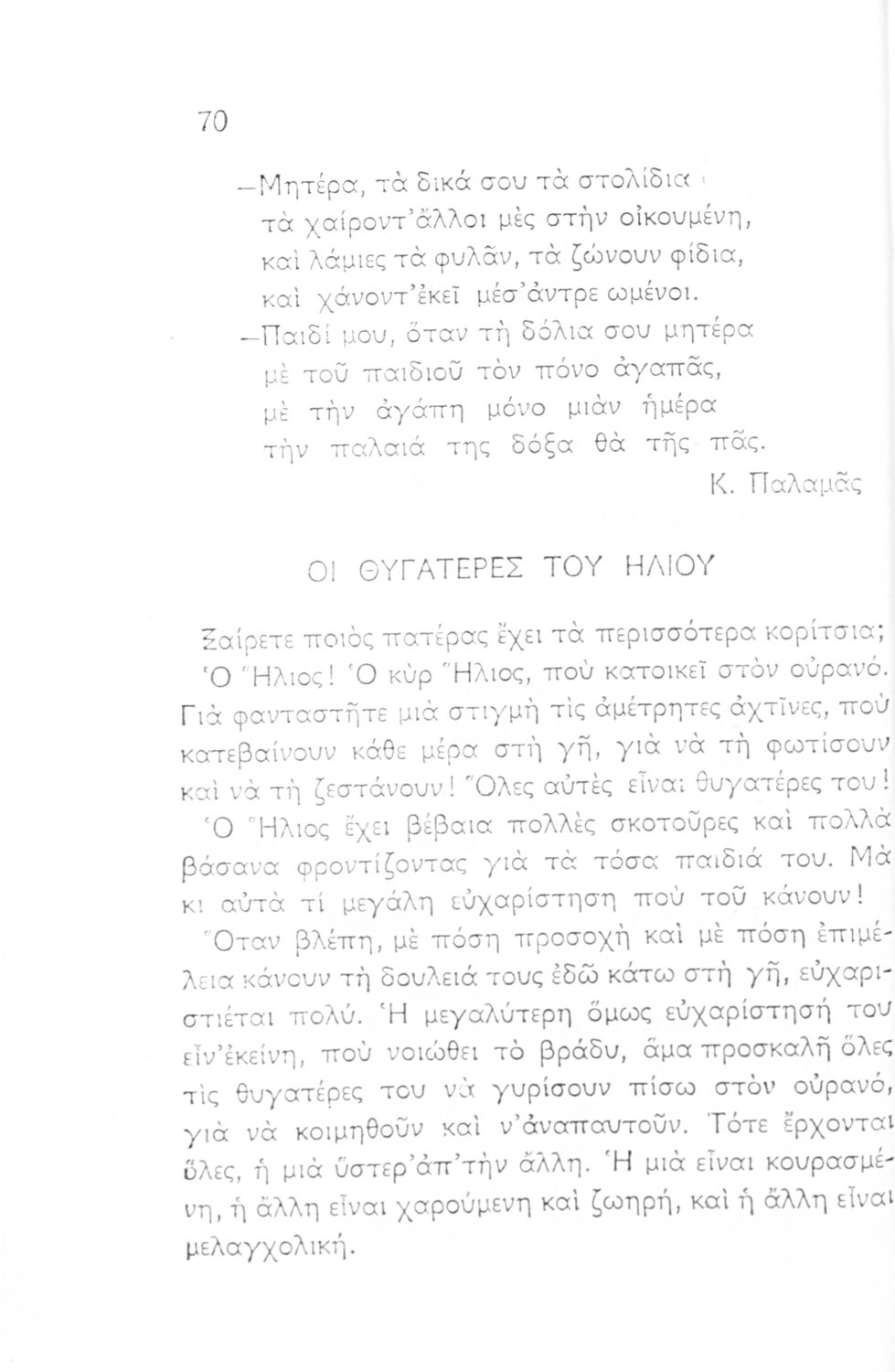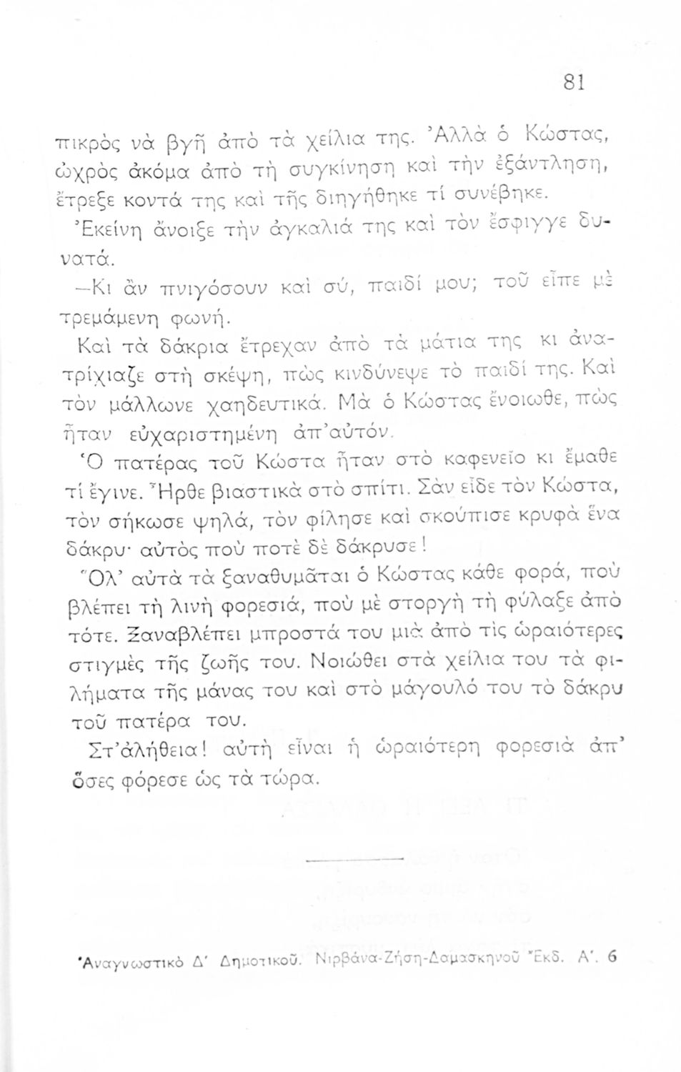 Αναγνωστικό ΣΤ΄ Δημοτικού που περιλαμβάνει πεζά και ποιήματα εμπνευσμένα από τη θρησκευτική, εθνική, οικογενειακή και κοινωνική ζωή, και την ελληνική φύση.
