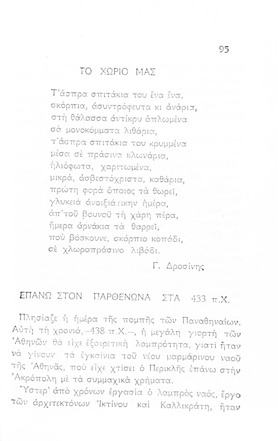 Αναγνωστικό Γ' Δημοτικού που περιέχει πεζά και ποιήματα εμπνευσμένα από τη θρησκευτική, εθνική, κοινωνική και ατομική ζωή, και την ελληνική φύση, ιστορία και μυθολογία.