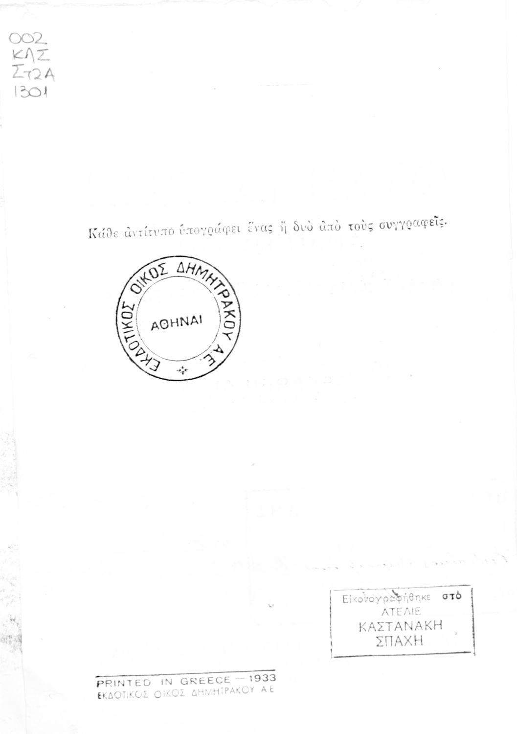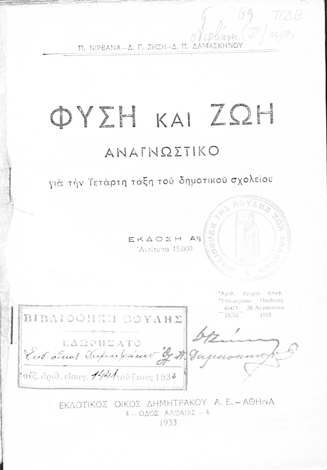 Εκδότης: Δημητράκος Έτος έκδοσης: 1933 Τόπος έκδοσης: Αθήνα Έκδοση: 1η Υπουργική απόφαση / Σύμβαση: 41473/26-8-1933 Έτος έγκρισης: 1933 |