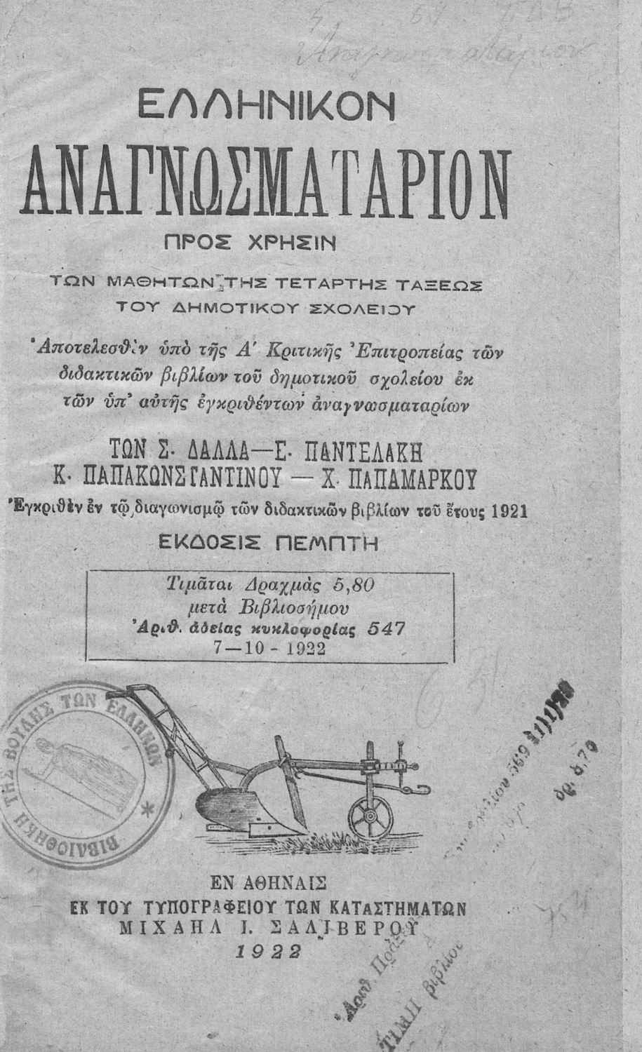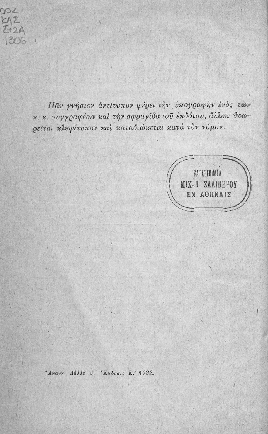 Εκδότης: Μιχαήλ Ι. Σαλίβερος Έτος έκδοσης: 1922 Τόπος έκδοσης: Αθήνα Έκδοση: 5η Υπουργική απόφαση / Σύμβαση: 547/7-10-1922 Έτος έγκρισης: 1922 |