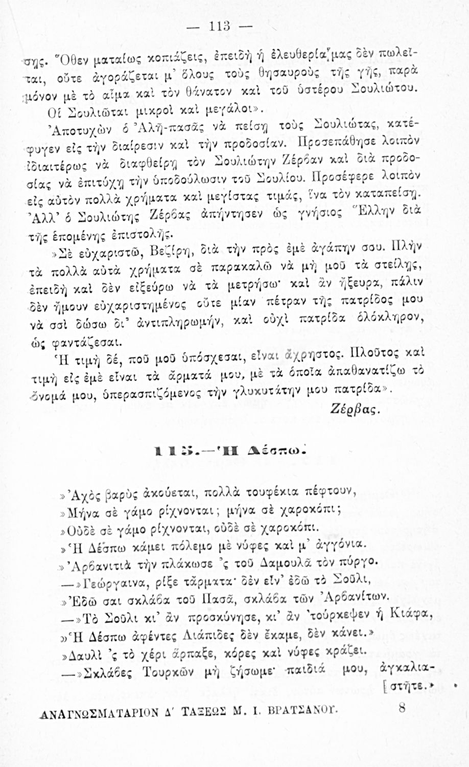 Κωδικός αναγνώρισης: 03-20561342 Τίτλος: Ελληνικόν αναγνωσματάριον προς χρήσιν των μαθητών της τετάρτης τάξεως του Δημοτικού Σχολείου Συγγραφέας: Μιλτιάδης Ι. Βρατσάνος Μέγεθος και υπόστρωμα: Σχολικό εγχειρίδιο, 175 σελίδες. |