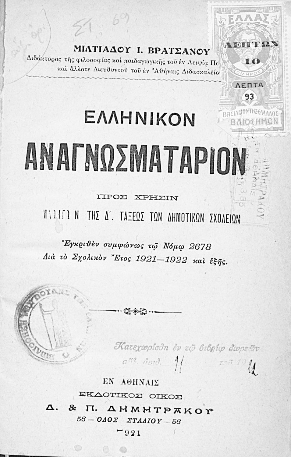 Τίτλος: Ελληνικόν αναγνωσματάριον προς χρήσιν των μαθητών της τετάρτης τάξεως του Δημοτικού Σχολείου