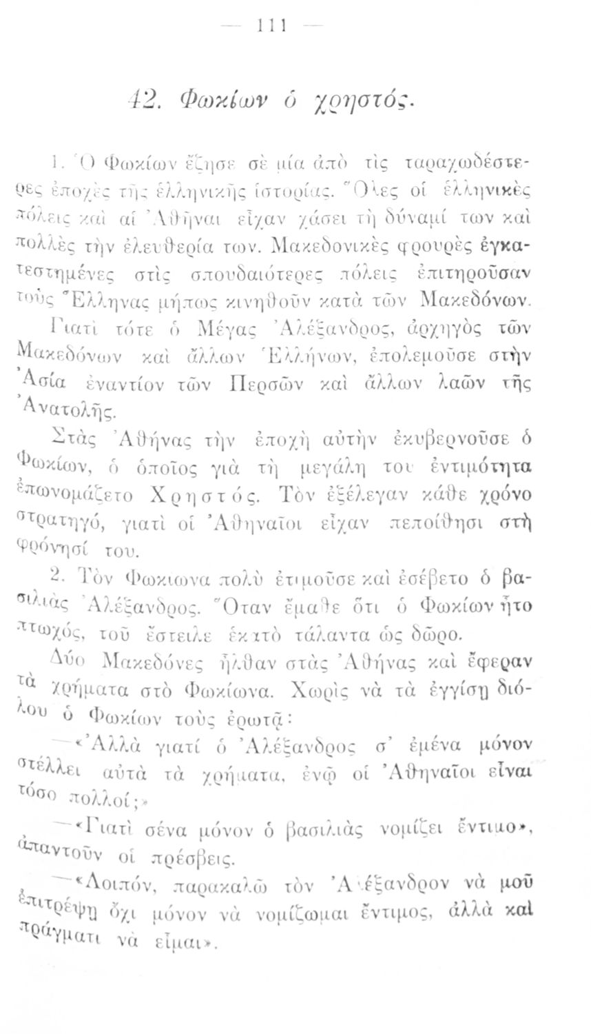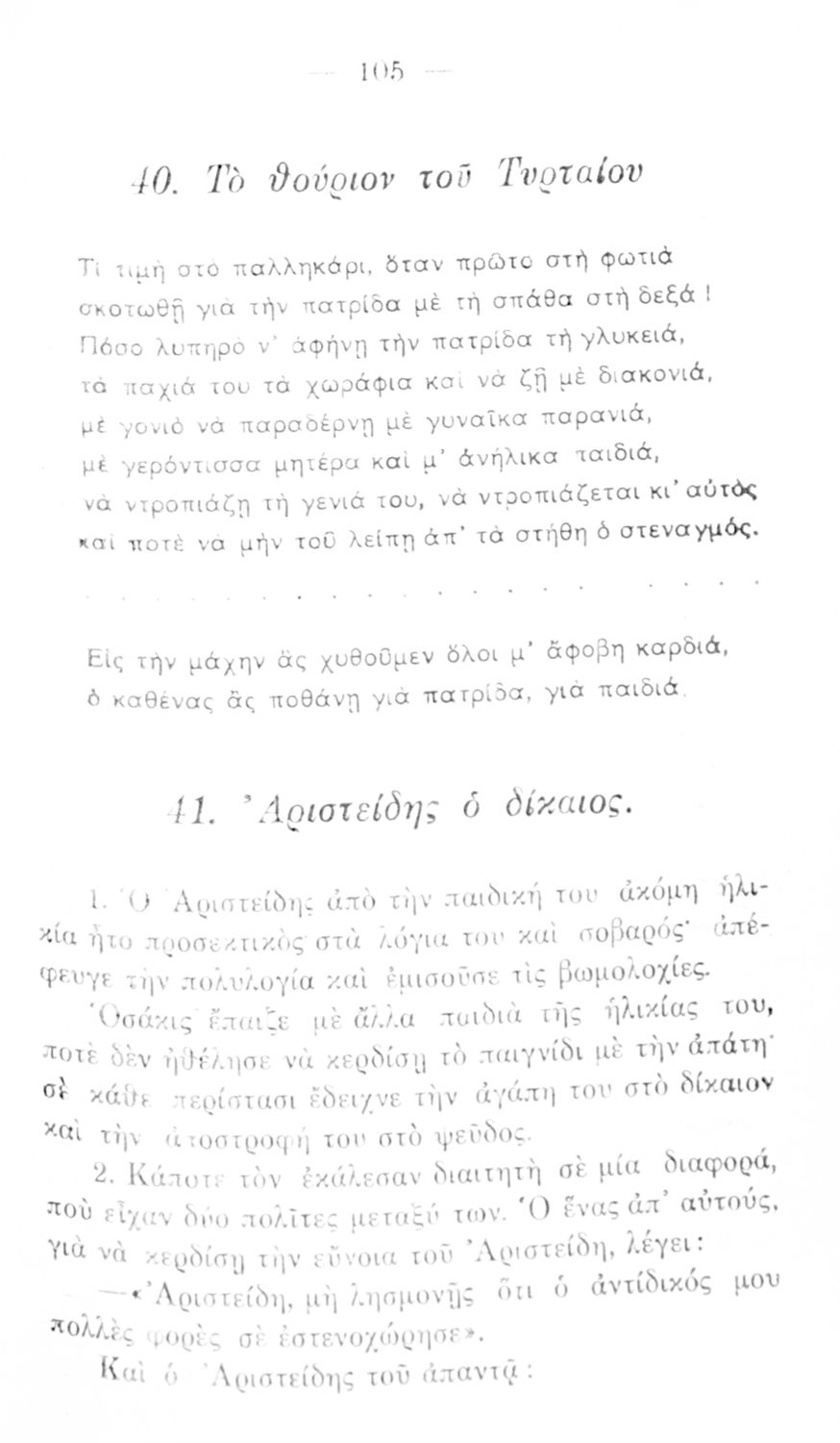 Αναγνωστικό Δ΄ Δημοτικού που περιλαμβάνει ποιήματα και πεζά με θέματα από την οικογενειακή, κοινωνική, πολιτική και ιδιωτική ζωή των Ελλήνων, τη φύση, την ιστορία και την θρησκεία τους.