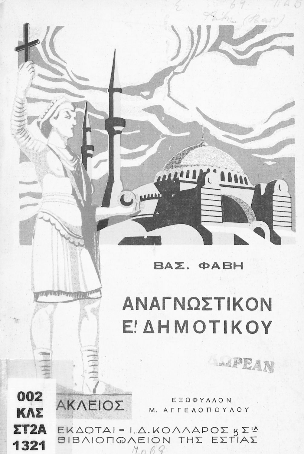 Κωδικός αναγνώρισης: 03-20561355 Τίτλος: Αναγνωστικόν E΄ Δημοτικού Συγγραφέας: Βασ. Φάβης Εικονογράφος: Μ. Αγγελοπούλου Μέγεθος και υπόστρωμα: Σχολικό εγχειρίδιο, 252 σελίδες. Εξώφυλλο (έγχρωμο), σκίτσα (ασπρόμαυρα). |