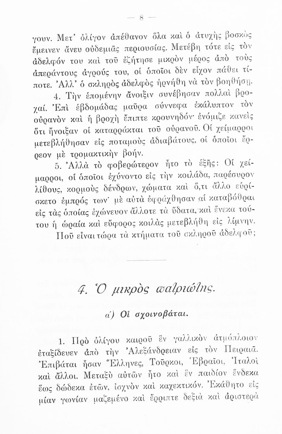 Βαθμίδα εκπαίδευσης: Πρωτοβάθμια Τάξη: Ε' Δημοτικού Μάθημα: Νέα Ελληνικά Γλώσσα: Απλή καθαρεύουσα Παρουσίαση περιεχομένου: Αναγνωστικό για τους μαθητές της Ε΄ Δημοτικού που περιλαμβάνει ποιήματα και πεζά με θέματα από την οικογενειακή, κοινωνική, πολιτιστική και ιδιωτική ζωή των Ελλήνων, τη φύση, την ιστορία και την θρησκεία τους. |