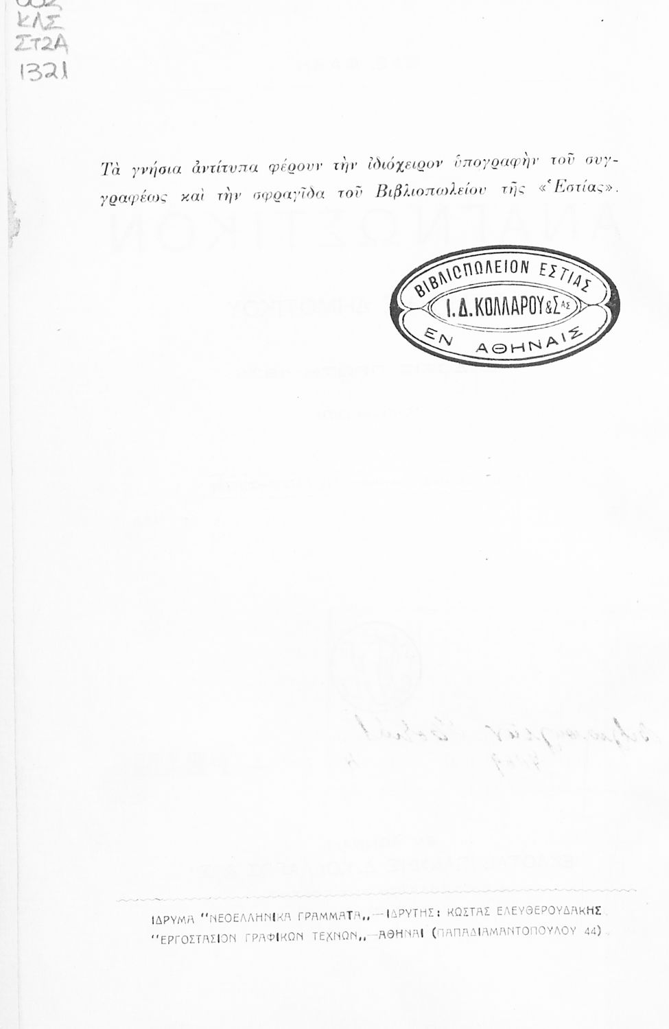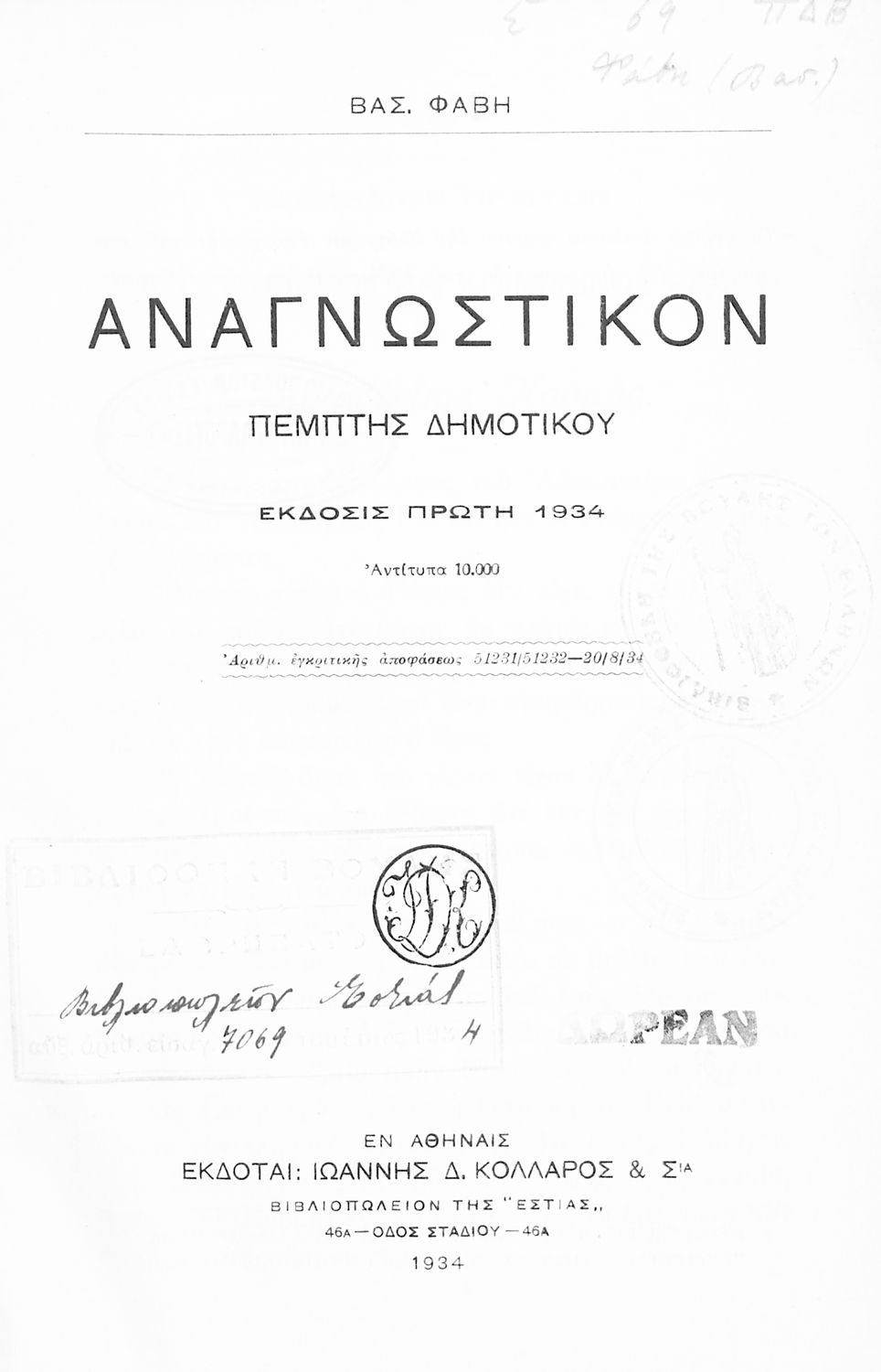 Εκδότης: Ιωάννης Δ. Κολλάρος Έτος έκδοσης: 1934 Τόπος έκδοσης: Αθήνα Έκδοση: 1η Υπουργική απόφαση / Σύμβαση: 51231/51232/20-8-1934 Έτος έγκρισης: 1934 |