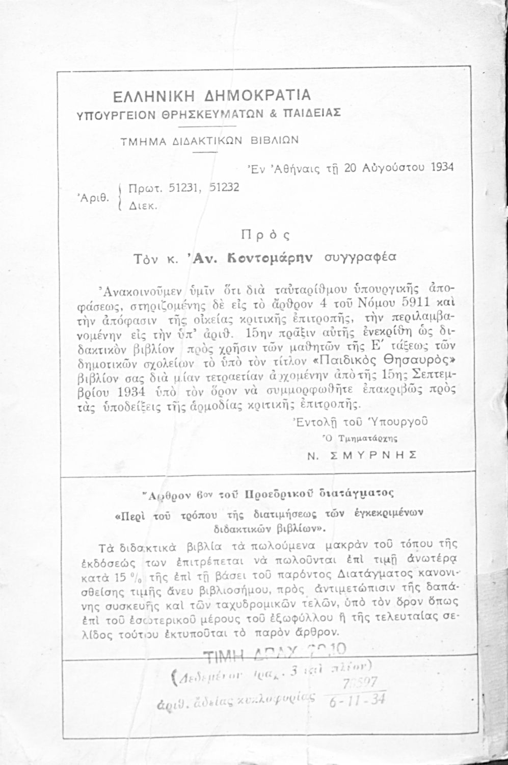 Υπουργική απόφαση / Σύμβαση: 51231/51232/20-8-1934