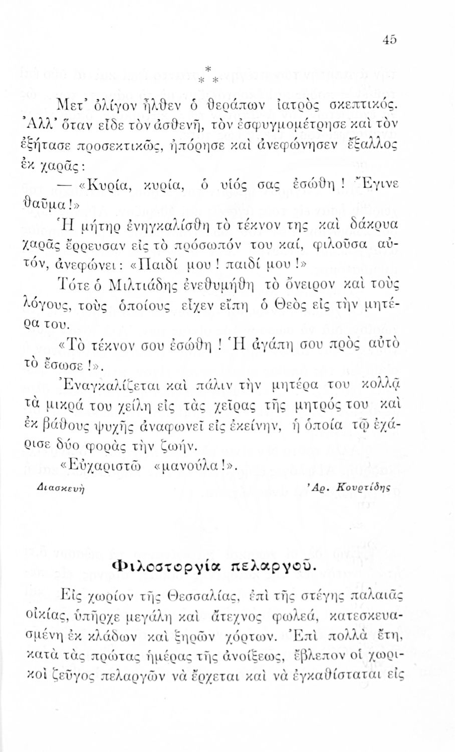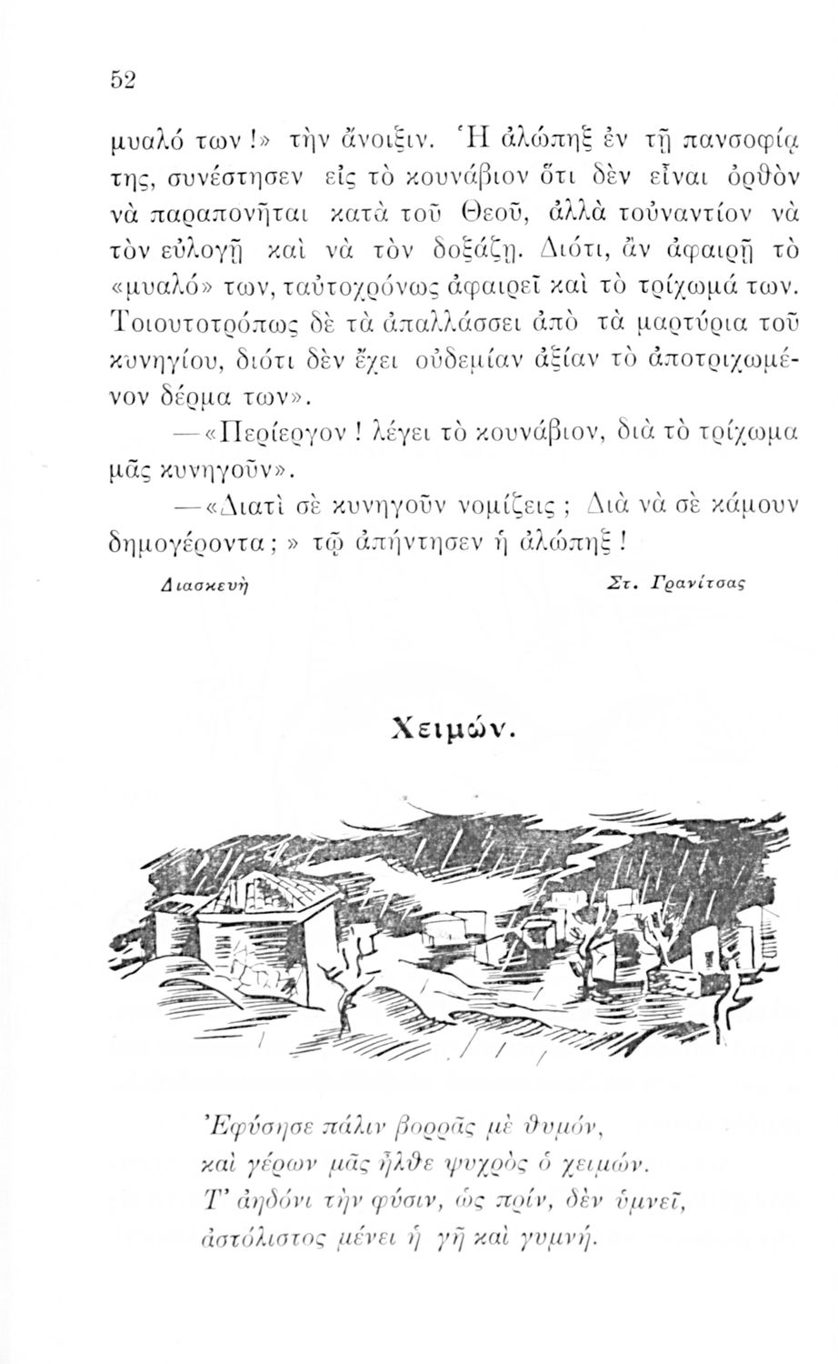 Αναγνωστικό Ε΄ Δημοτικού που περιλαμβάνει πεζογραφήματα εμπνευσμένα από την ελληνική φύση, την αγροτική ζωή και από το τρίπτυχο "Πατρίς- θρησκεία- οικογένεια".