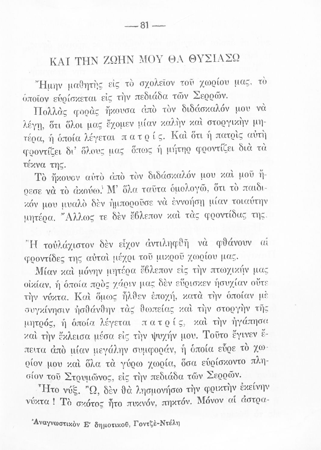 Αναγνωστικό της ΣΤ΄ Δημοτικού που κυκλοφόρησε σε 7.000 αντίτυπα 25 ημέρες πριν την 4η Αυγούστου 1936, οπότε κατά την επόμενη σχολική χρονιά διδάχτηκε ελάχιστα και η έκδοσή του με αυτή την μορφή σταμάτησε.