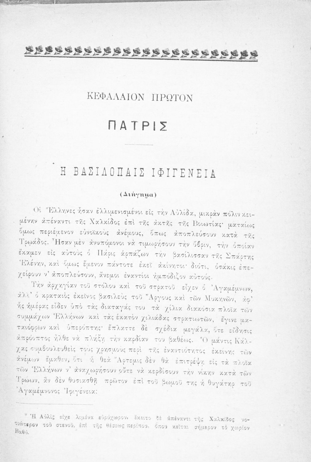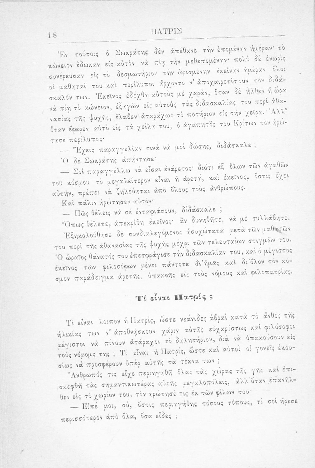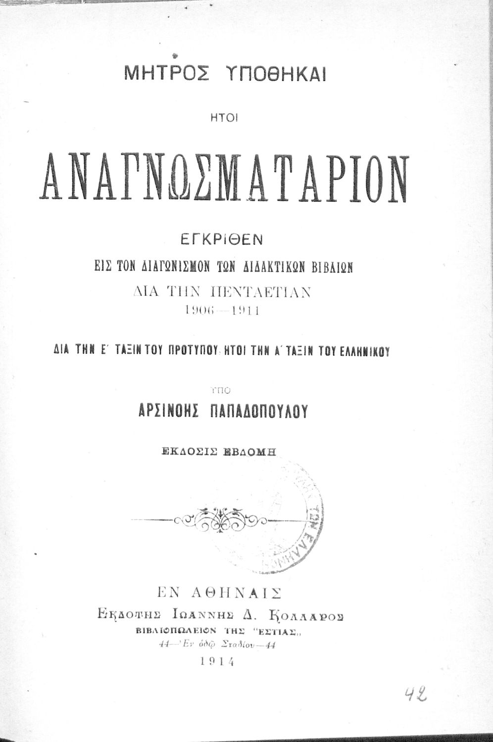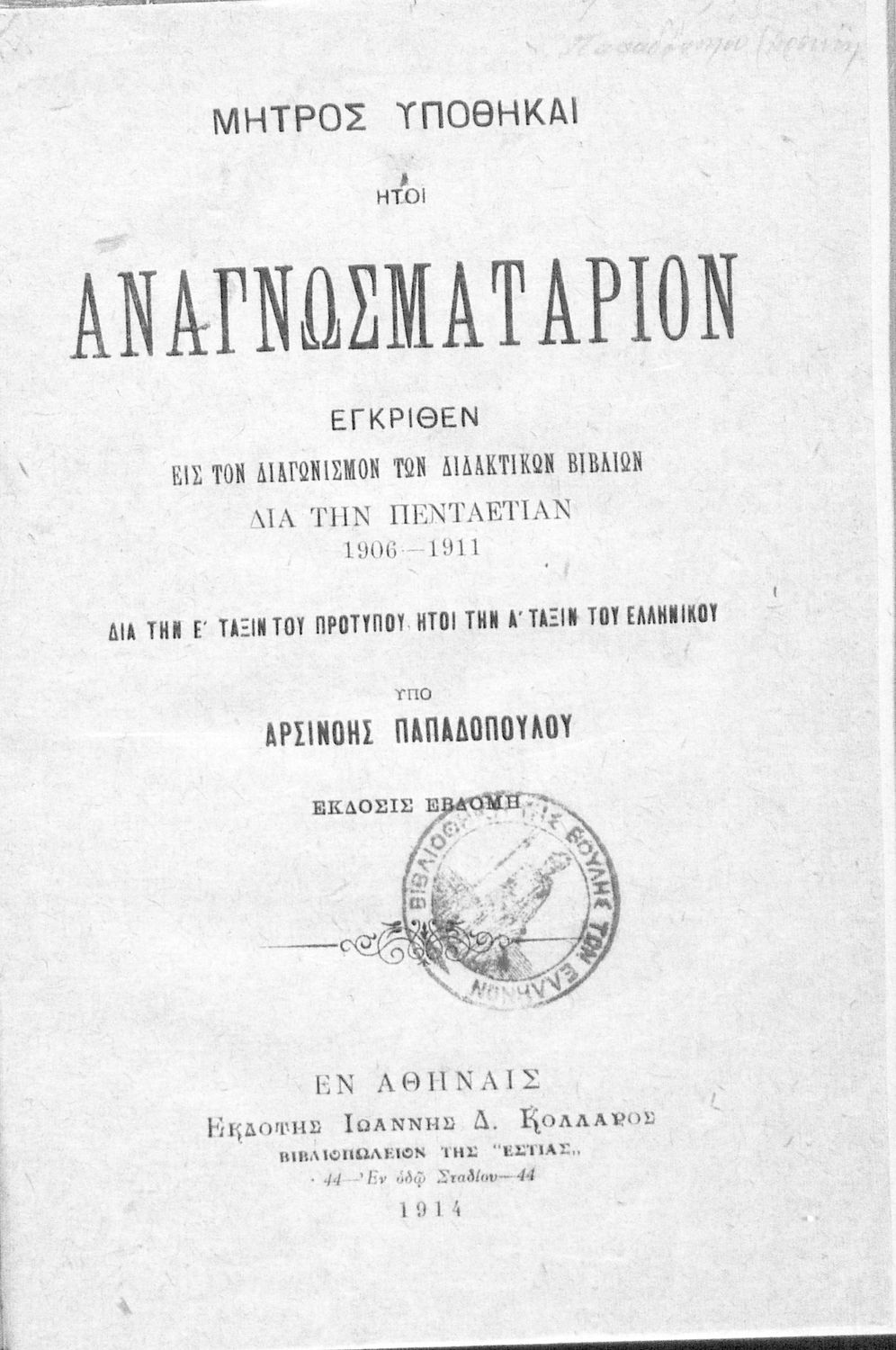 Βαθμίδα εκπαίδευσης: Δευτεροβάθμια Τάξη: Α' Ελληνικού Σχολείου Μάθημα: Νέα Ελληνικά Γλώσσα: Καθαρεύουσα Παρουσίαση περιεχομένου: Αναγνωστικό για την Α΄ Ελληνικού Σχολείου για το μάθημα των Νέων Ελληνικών. Περιλαμβάνει πεζά και ποιήματα, των οποίων η θεματογραφία έχει περιεχόμενο εθνικό, πατριωτικό, οικογενειακό, ηθικών αξιών, φυσιογνωστικό, ιστορικό και βιογραφικό. Το σύγγραμμα ήταν εγκεκριμένο για μια πενταετία. |