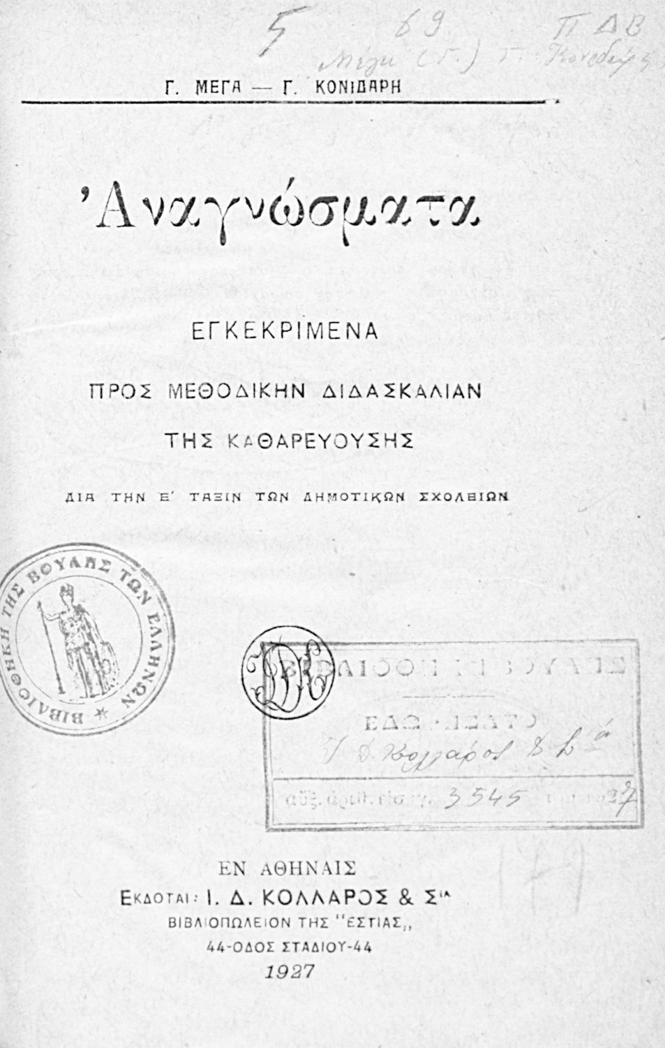 Εκδότης: Ιωάννης Δ. Κολλάρος Έτος έκδοσης: 1927 Τόπος έκδοσης: Αθήνα |