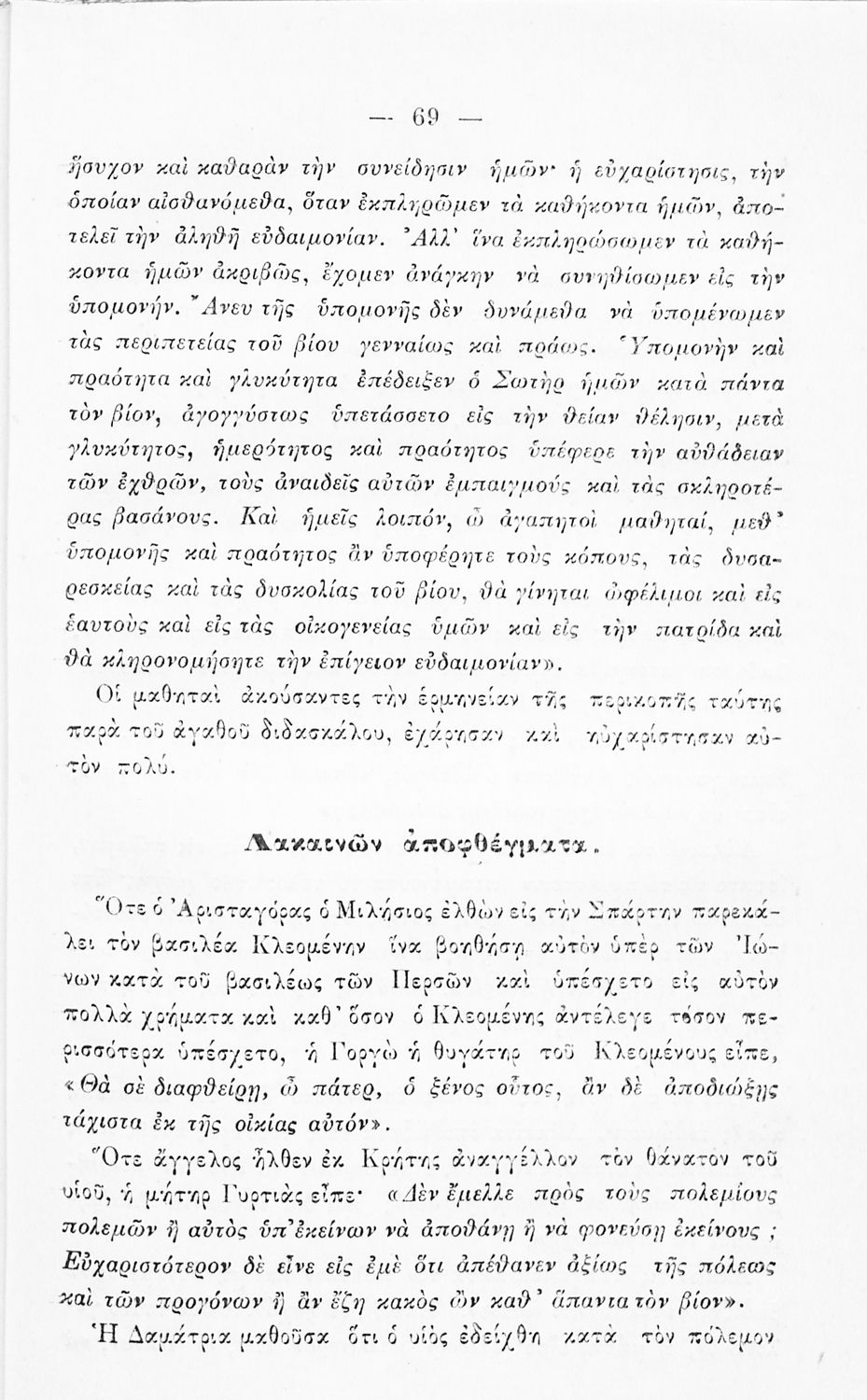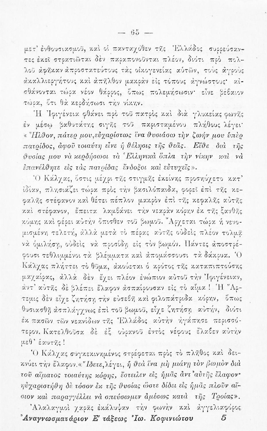 Βαθμίδα εκπαίδευσης: Πρωτοβάθμια Τάξη: Ε' Δημοτικού Μάθημα: Νέα Ελληνικά Γλώσσα: Καθαρεύουσα Παρουσίαση περιεχομένου: Αναγνωστικό Ε΄ Δημοτικού που περιλαμβάνει ποιήματα και πεζά ηθοποιητικού περιεχομένου που αντλούν τα θέματά τους από την αρχαία και σύγχρονη ελληνική ιστορία. |
