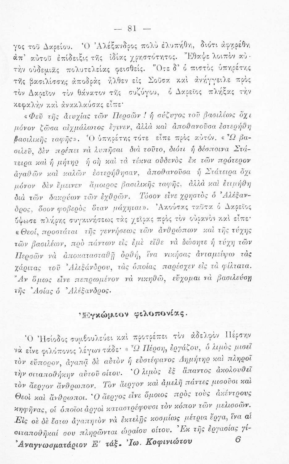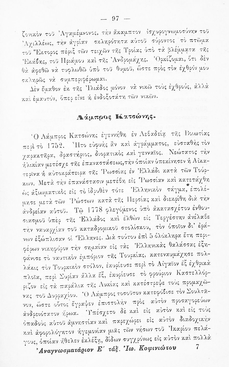 Βαθμίδα εκπαίδευσης: Πρωτοβάθμια Τάξη: Ε' Δημοτικού Μάθημα: Νέα Ελληνικά Γλώσσα: Καθαρεύουσα Παρουσίαση περιεχομένου: Αναγνωστικό Ε΄ Δημοτικού που περιλαμβάνει ποιήματα και πεζά ηθοποιητικού περιεχομένου που αντλούν τα θέματά τους από την αρχαία και σύγχρονη ελληνική ιστορία. |