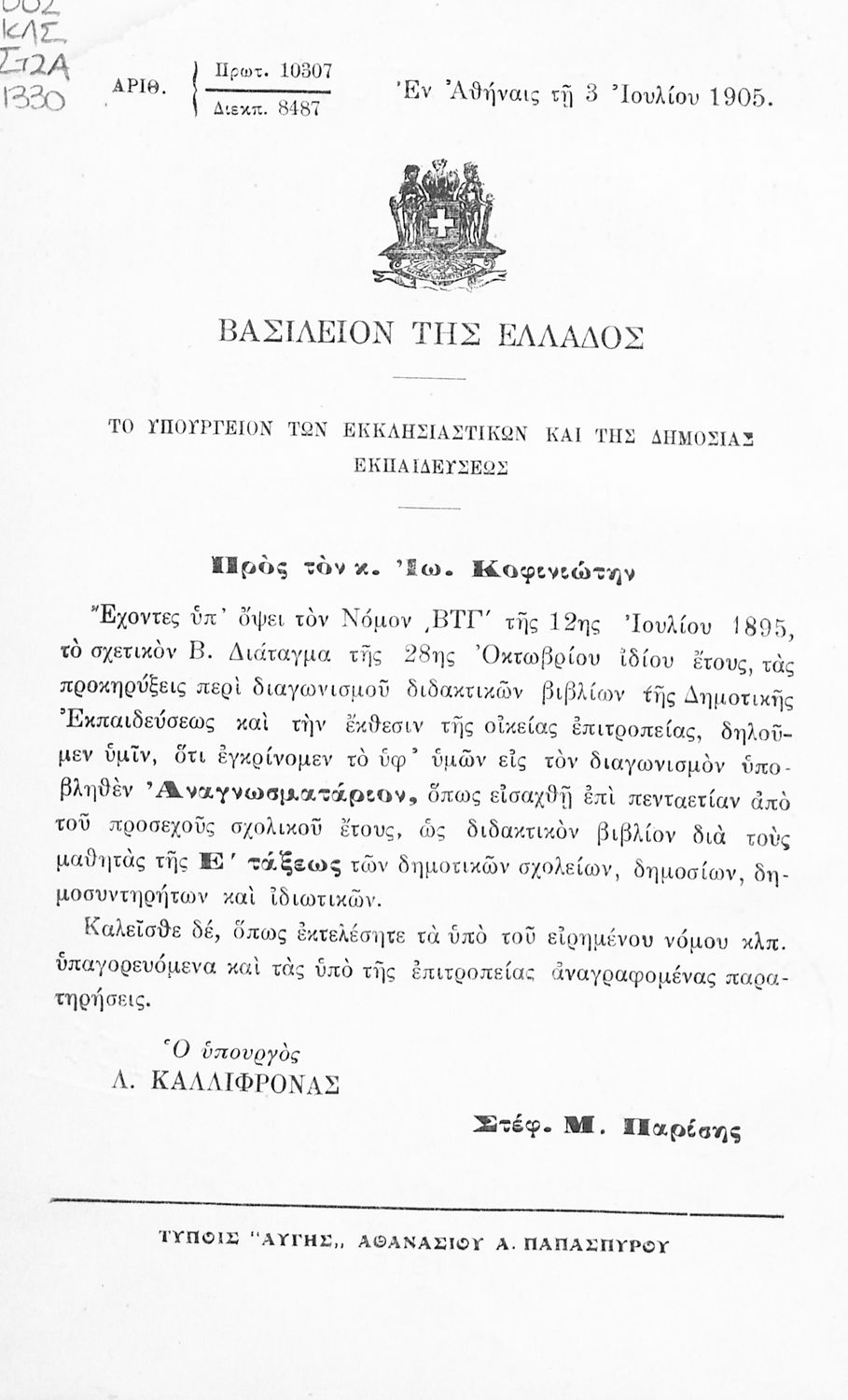 Τίτλος: Ελληνικόν αναγνωσματάριον δια τους μαθητάς της Ε΄ τάξεως των Δημοτικών Σχολείων αμφοτέρων των φύλων