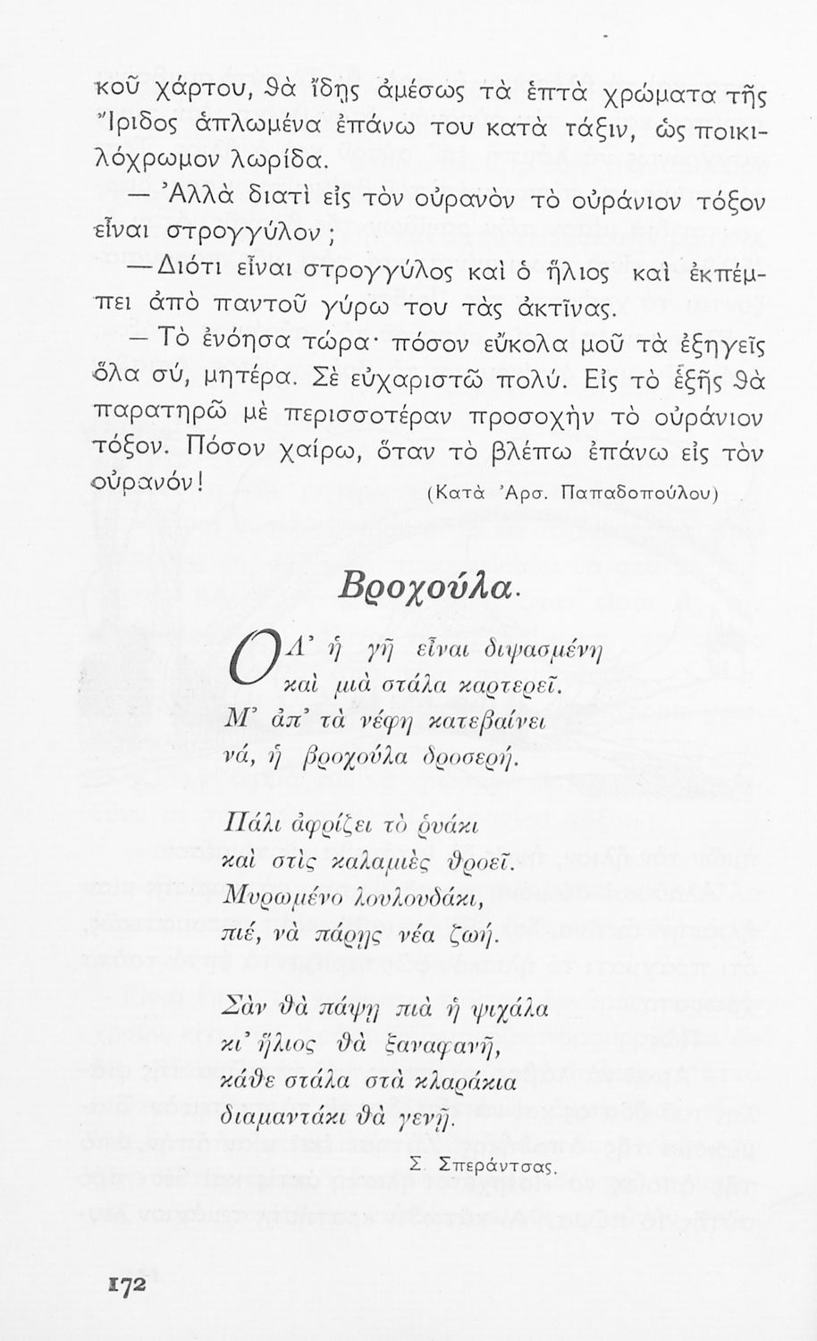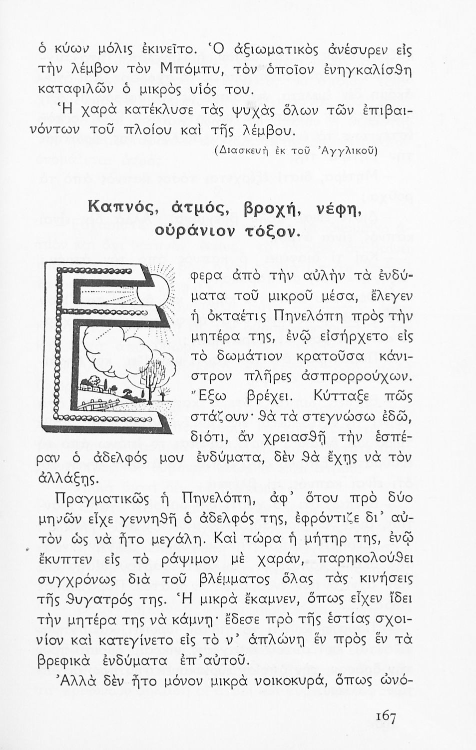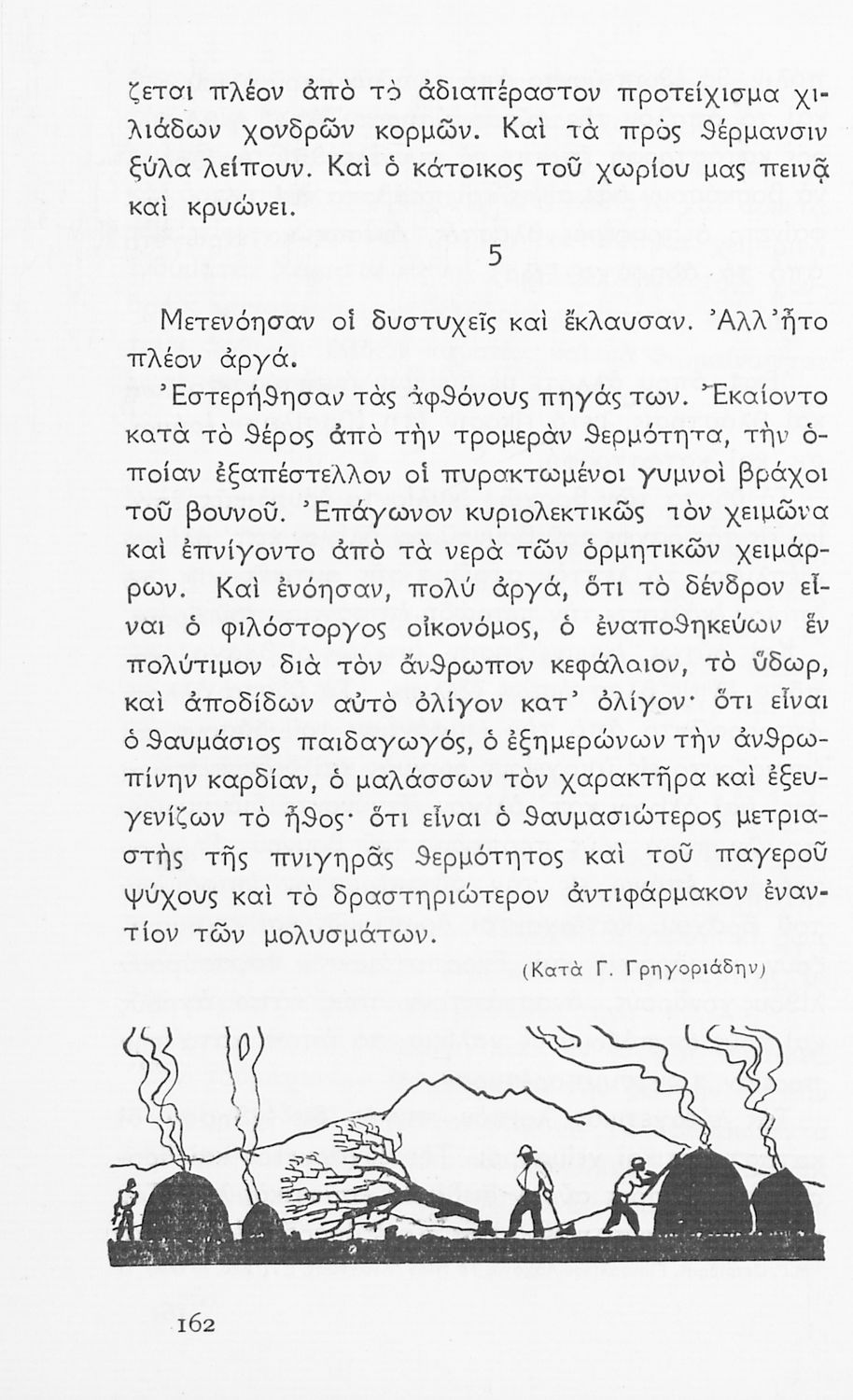 Αναγνωστικό Ε΄ Δημοτικού που περιλαμβάνει πεζογραφήματα εμπνευσμένα από την ελληνική φύση, την αγροτική ζωή και από το τρίπτυχο "Πατρίς- θρησκεία- οικογένεια".