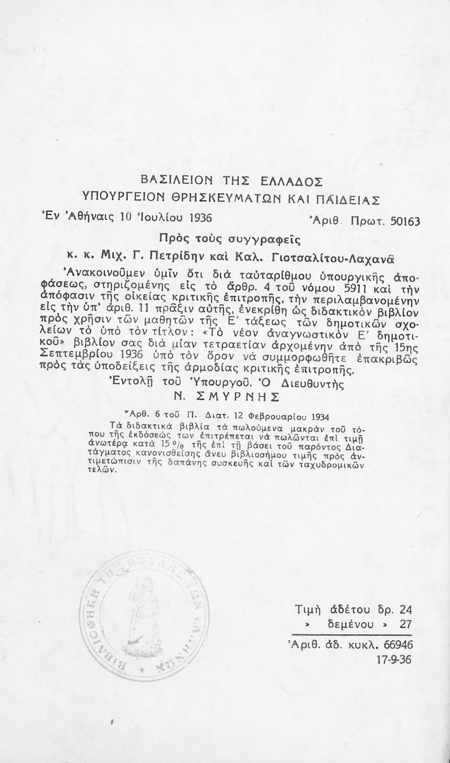 Εκδότης: Α.Ι. Ράλλης Έτος έκδοσης: 1936 Τόπος έκδοσης: Αθήνα Έκδοση: 1η Υπουργική απόφαση / Σύμβαση: 50163/10-7-1936 Έτος έγκρισης: 1936 |
