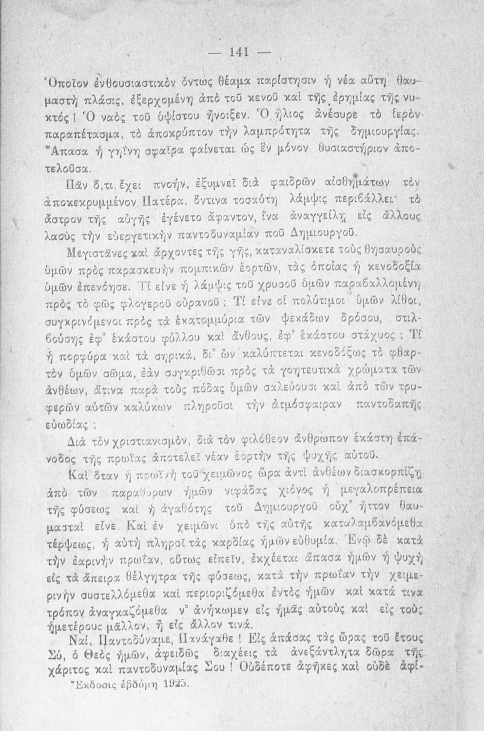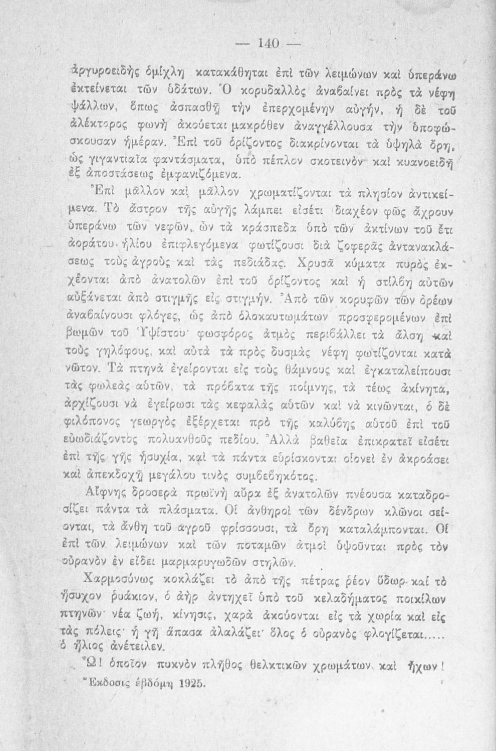 Αναγνωστικό Ε' Δημοτικού που περιέχει πεζά και ποιήματα εμπνευσμένα από τη θρησκευτική, εθνική, κοινωνική και ατομική ζωή, και την ελληνική φύση και ιστορία.