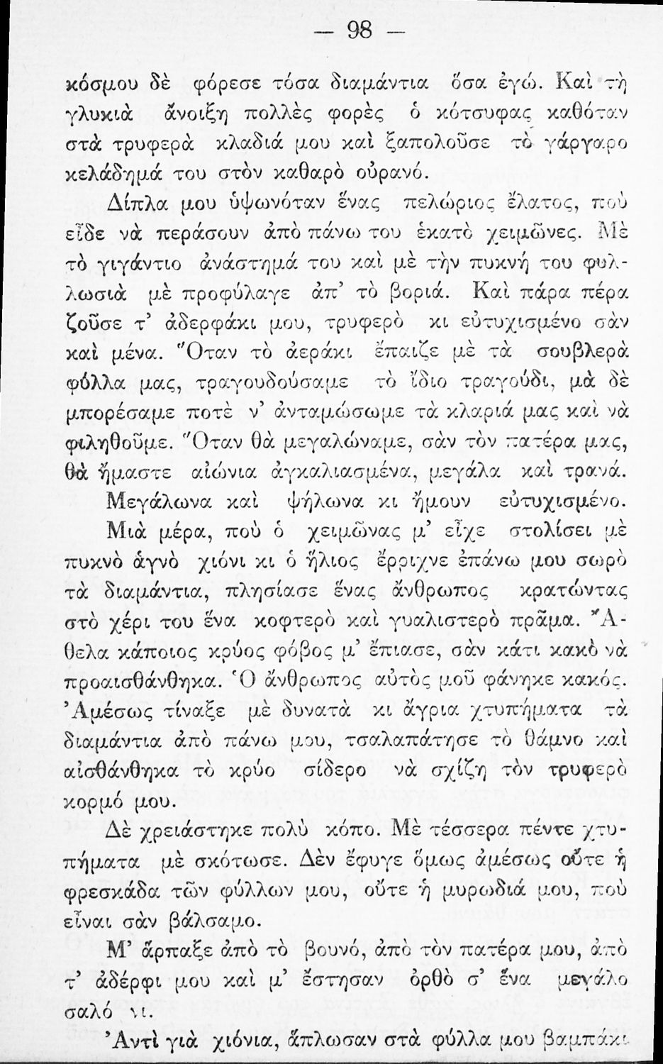 Αναγνωστικό Ε΄ Δημοτικού που περιλαμβάνει ποιήματα και πεζά που αντλούν τα θέματά τους από την σύγχρονη ελληνική ιστορία, την ελληνική μυθολογία, τη βυζαντινή ιστορία, τη θρησκεία και την καθημερινή ζωή των ανθρώπων.