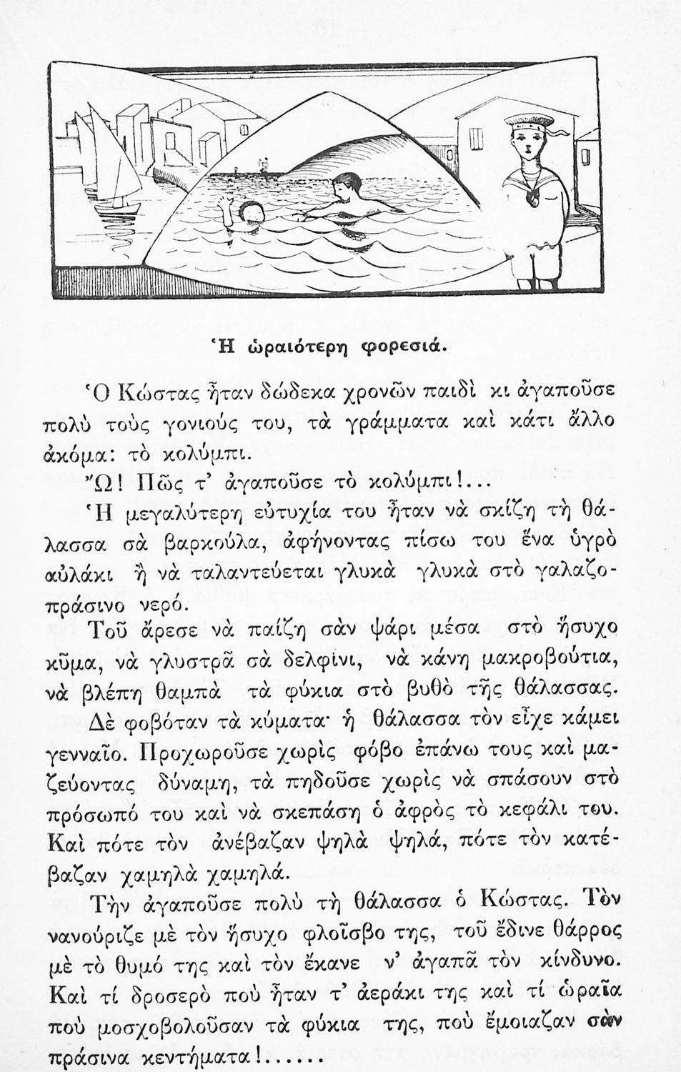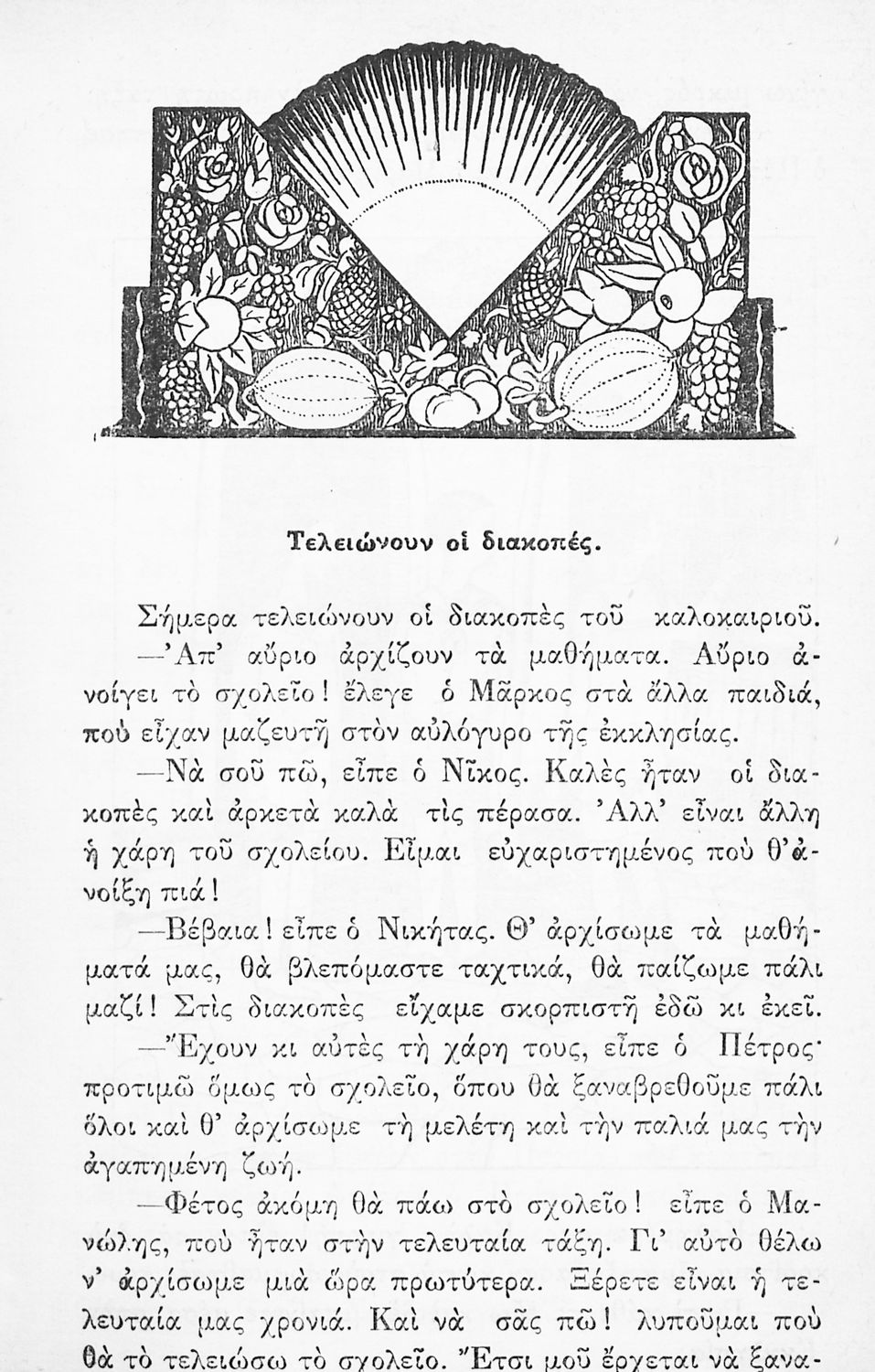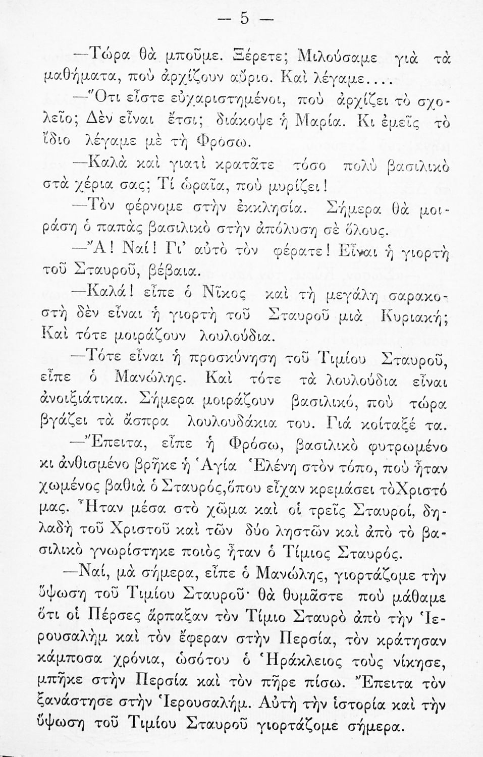 Αναγνωστικό Ε΄ Δημοτικού που περιλαμβάνει ποιήματα και πεζά που αντλούν τα θέματά τους από την σύγχρονη ελληνική ιστορία, την ελληνική μυθολογία, τη βυζαντινή ιστορία, τη θρησκεία και την καθημερινή ζωή των ανθρώπων.