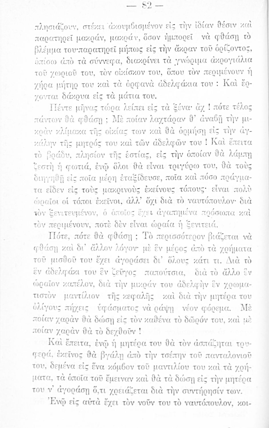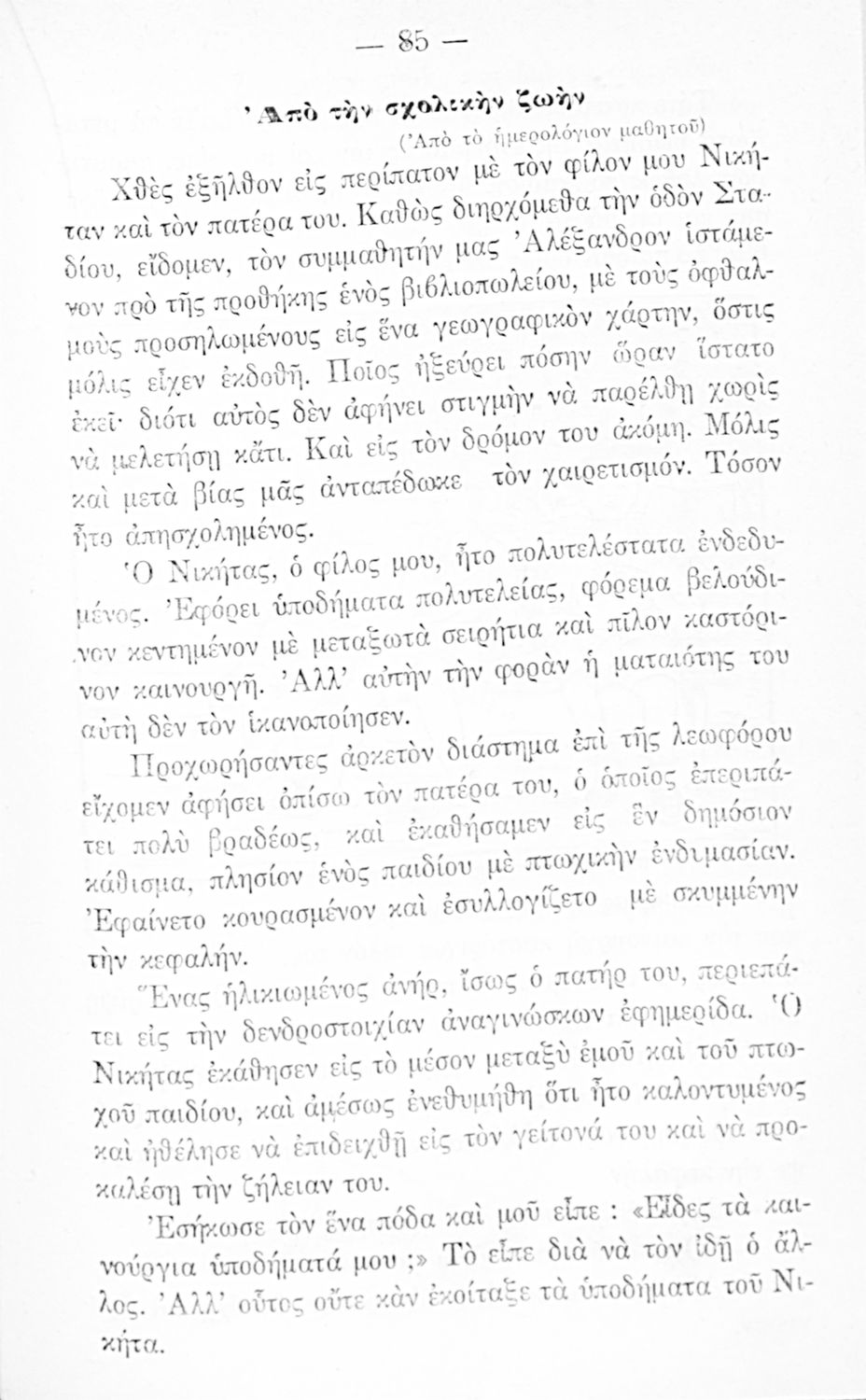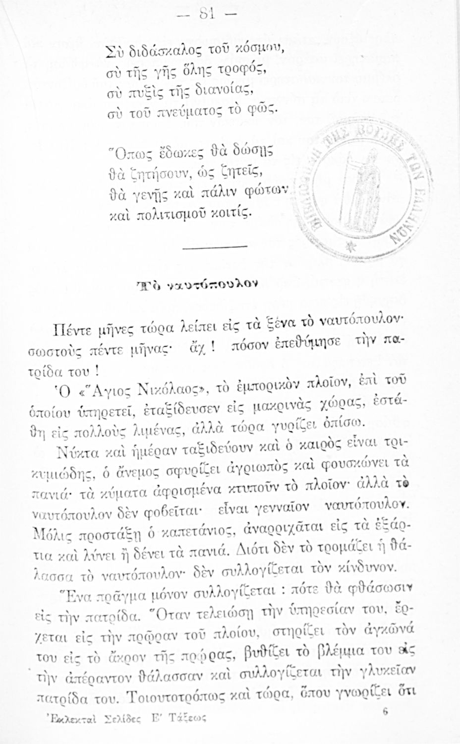 Βαθμίδα εκπαίδευσης: Πρωτοβάθμια Τάξη: Ε' Δημοτικού Μάθημα: Νέα Ελληνικά Γλώσσα: Απλή καθαρεύουσα Παρουσίαση περιεχομένου: Αναγνωστικό Ε΄ Δημοτικού που περιλαμβάνει ποιήματα και πεζά που αντλούν τα θέματά τους από την αρχαία και σύγχρονη ελληνική ιστορία, την ελληνική μυθολογία, τη βυζαντινή ιστορία, τη θρησκεία και την καθημερινή ζωή των ανθρώπων. |