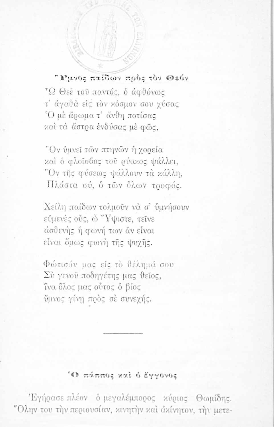 Αναγνωστικό Ε΄ Δημοτικού που περιέχει πεζά και ποιήματα εμπνευσμένα από τη θρησκευτική, εθνική, κοινωνική ζωή καθώς και από τις ασχολίες των Ελλήνων, την αρχαία και σύγχρονη ελληνική ιστορία και τον πολιτισμό.
