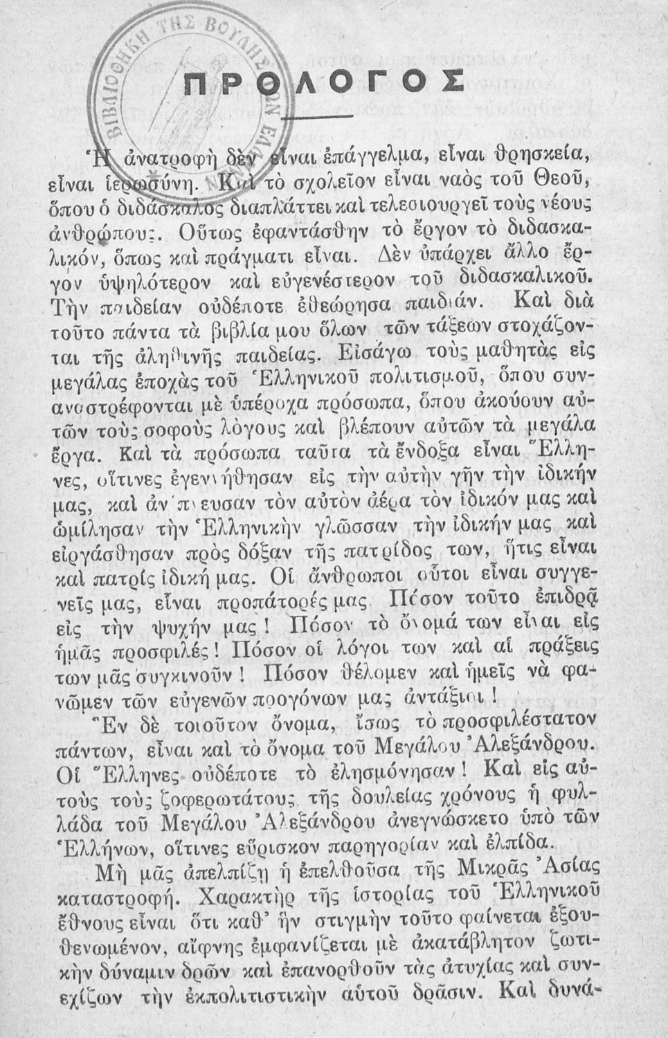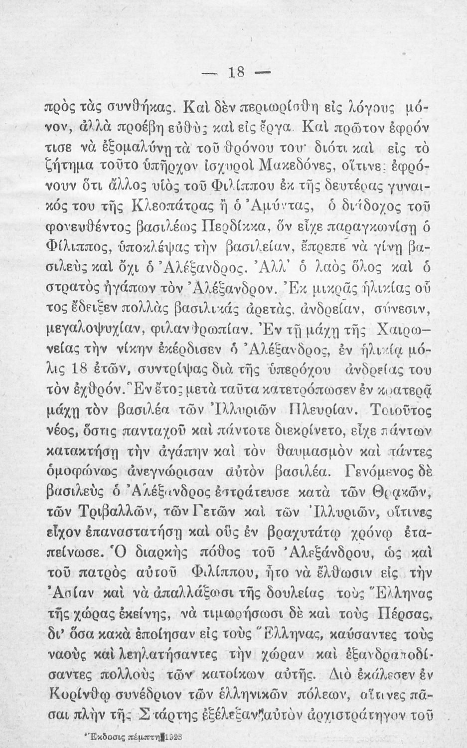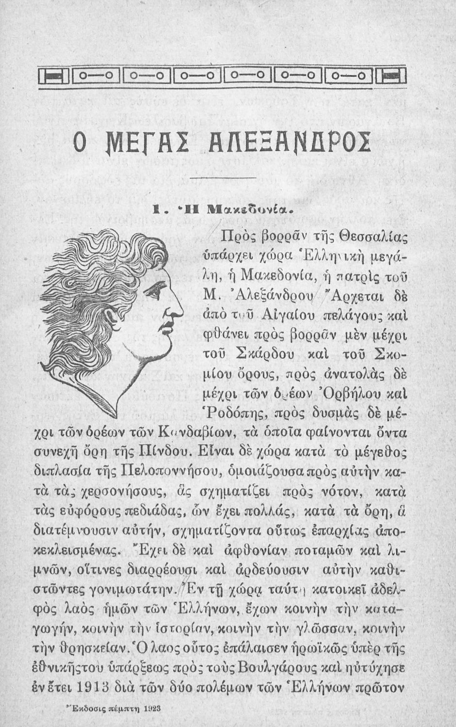 Αναγνωστικό για την Ε΄ Δημοτικού που εξιστορεί την ιστορία του Μεγάλου Αλεξάνδρου με σκοπό να εξυψώσει το φρόνημα των Ελλήνων, που έχει "πληγεί από τη Μικρασιατική καταστροφή", και να τους δώσει "παρηγοριά και ελπίδα". Θεωρεί ότι η "επίσημη γλώσσα του κράτους" είναι και η "πρέπουσα" για αυτό το σκοπό, σε αντίθεση με τη "μαλλιαρή γλώσσα" που είναι "επιδημία γλωσσική" και "γλωσσικός εξανθηματικός τύφος" και άρα δεν μπορεί να ευδοκιμήσει "σε κλίμα και έδαφος Ελληνικόν". Κατά τον συγγραφέα, οι "μαλλιαροί υβρίζουν το λαό και τον υποβιβάζουν στη θέση του δουλοπάροικου".