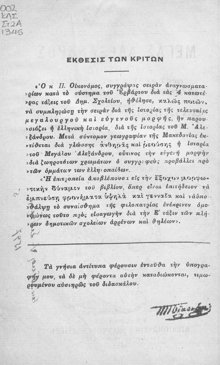 Αναγνωστικό Ε' Δημοτικού που εξιστορεί τη ζωή και το έργο του Μ. Αλεξάνδρου. Προοριζόταν, όπως αναφέρει η έκθεση των κριτών, να εμπνεύσει "φρονήματα υψηλά και γενναία και να υποθάλψη το συναίσθημα της ...