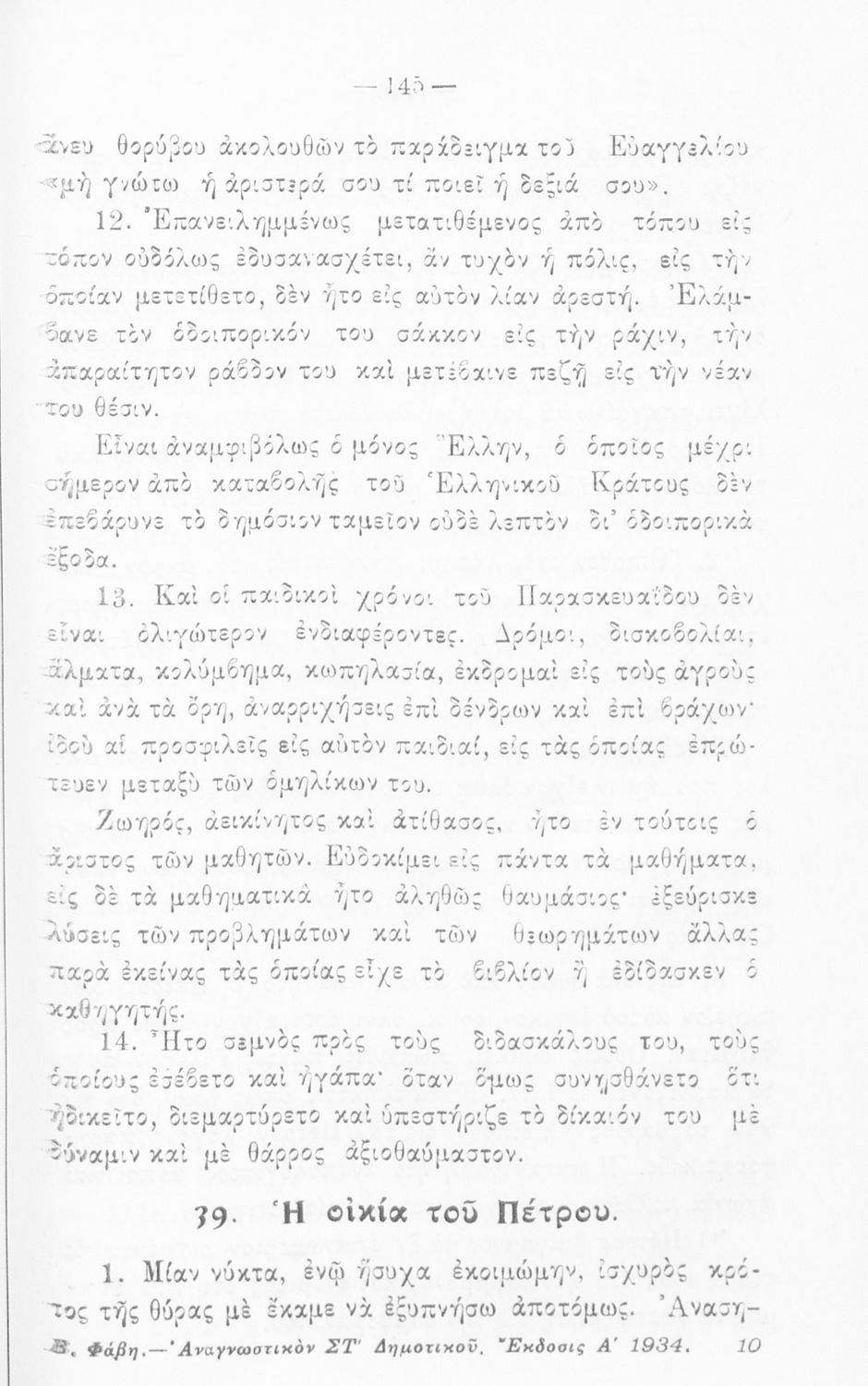 Αναγνωστικό ΣΤ΄ Δημοτικού που περιλαμβάνει θέματα από τις ελληνικές παραδόσεις και μύθους, την ελληνική φύση και θάλασσα και το τρίπτυχο "Πατρίς-θρησκεία-οικογένειαα".